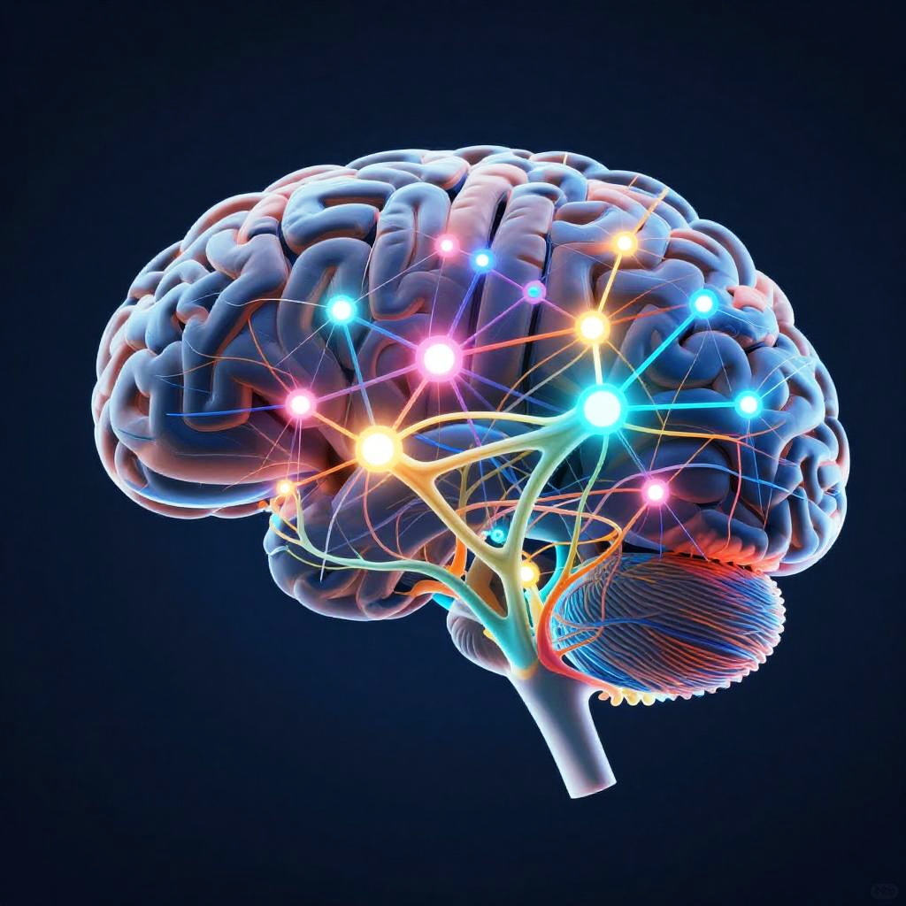 Diagrama showcasing an abstract representation of a brain's neural network, colorful glowing synapses connected by fine bright filaments on a dark blue background, cybernetic and organic fusion, vibrant and dynamic composition.