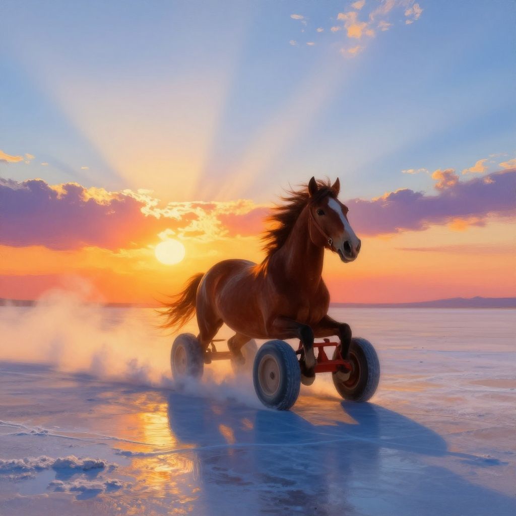 Photograph of a galloping brown horse with four wheels, kicking up snow, against a vibrant sunset over a frozen landscape.