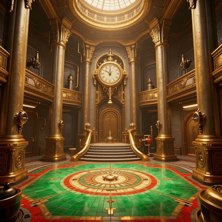 The image depicts a highly detailed and intricately designed interior space, reminiscent of a futuristic, industrial setting. The scene is bathed in warm, golden light, creating a contrast with the cool, metallic surfaces. The room features grand, ornate columns and a central staircase leading to a raised platform, adorned with a large, ornate clock. The floor is a vibrant mosaic of green and red tiles, with a circular emblem at the center. Various mechanical elements and pipes are visible, adding to the industrial aesthetic. The overall composition is symmetrical, with objects and structures arranged in a balanced manner, creating a sense of order and grandeur. The scene is likely from a concept art piece or a video game, showcasing the advanced visual capabilities of Unreal Engine 5, with its 4K resolution.