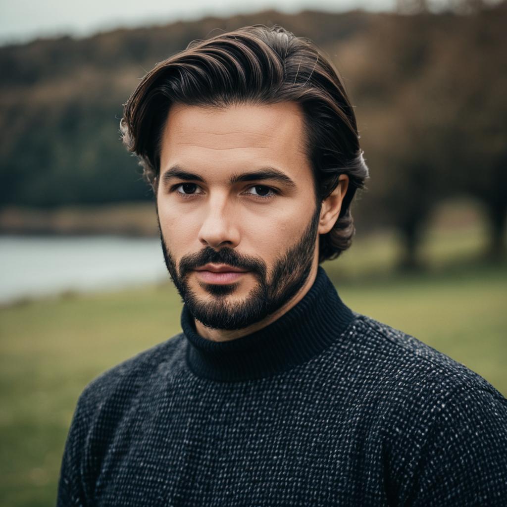 Going out ords,1boy, male focus, solo, realistic, jacket, shirt, black shirt, facial hair, blurry background, looking at viewer, blurry, open clothes, brown hair, outdoors, closed mouth, brown jacket, open jacket, short hair