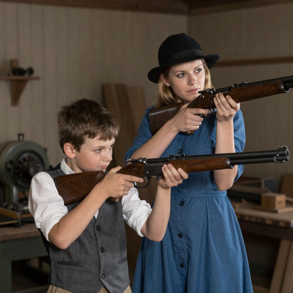 Photograph of a young woman in a blue dress and black hat, holding a rifle, standing beside a young boy in a white shirt and gray vest, both aiming the rifle. They are in a dimly lit, rustic workshop with wooden walls and industrial machinery in the background. The woman has light skin and blonde hair, while the boy has light skin and brown hair.