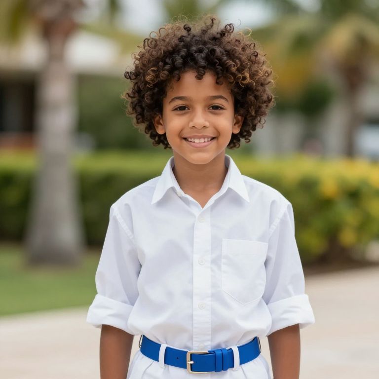Caribbean Fancy Dress Boy, boy with curly hair wearing a white shirt and blue belt