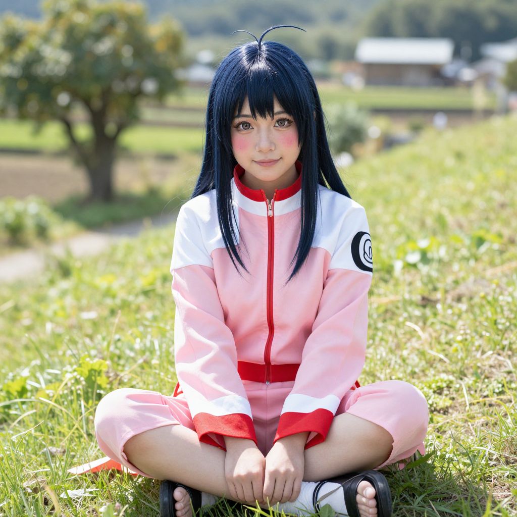 Photograph of an Asian woman with long black hair, wearing a pink and white anime-style outfit, sitting cross-legged on grass in a sunlit,