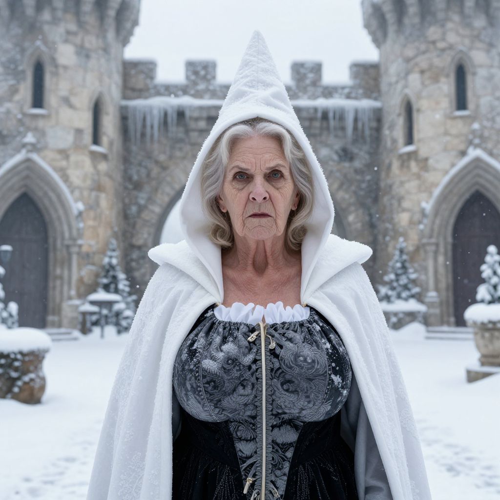 Photorealistic image of a weathered old woman dressed as a snow white witch in a white and black costume, her face full of age lines, with a stern expression, standing in a cold, frosty castle courtyard with snow-covered stone walls and icicles hanging from the roof.. The woman has big breasts and cute face