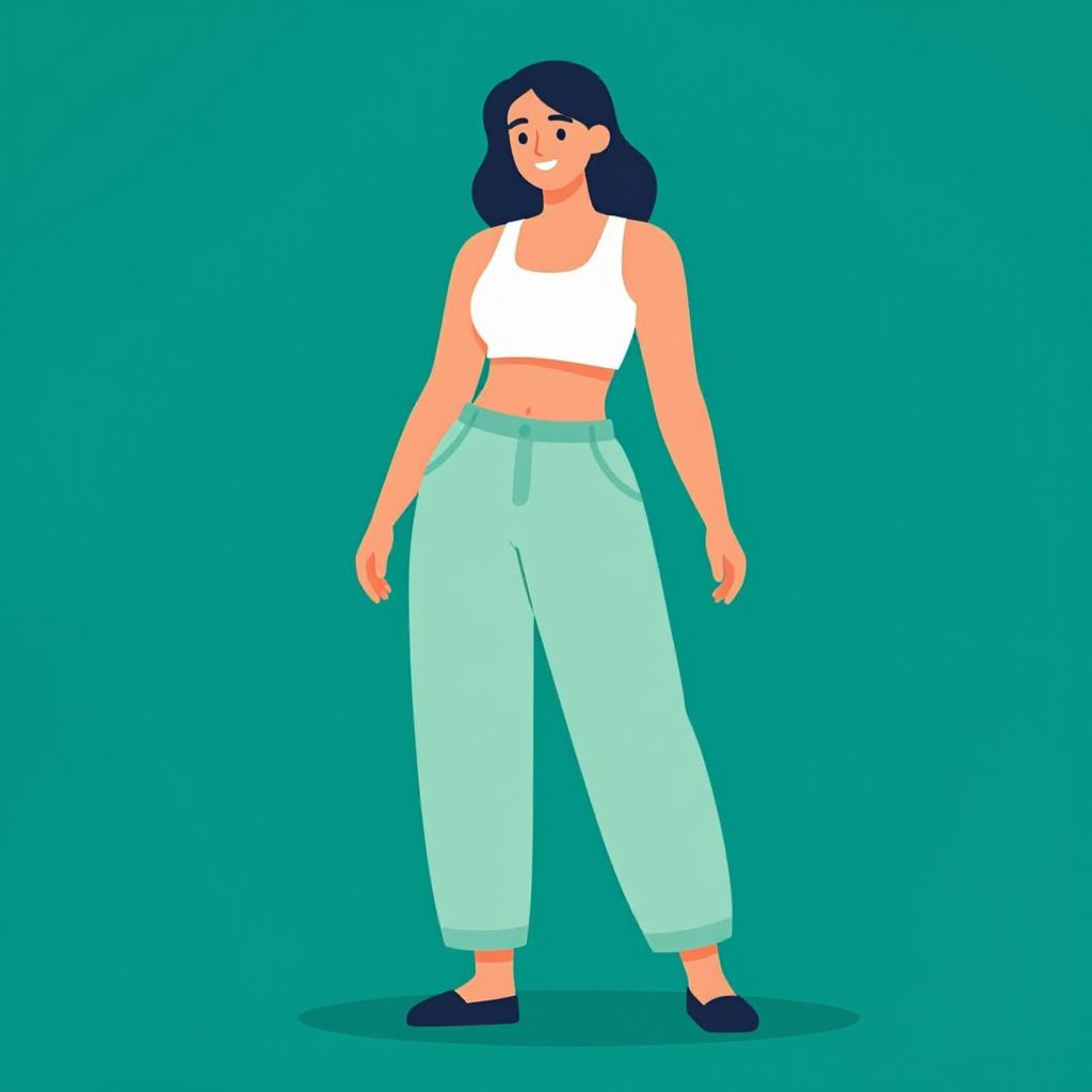 Young happy caucasian woman on a diet. Slim smiling woman in oversized pants showing the results of her diet. Concept of dieting and healthy lifestyle. Vector flat design illustration. Square layout.