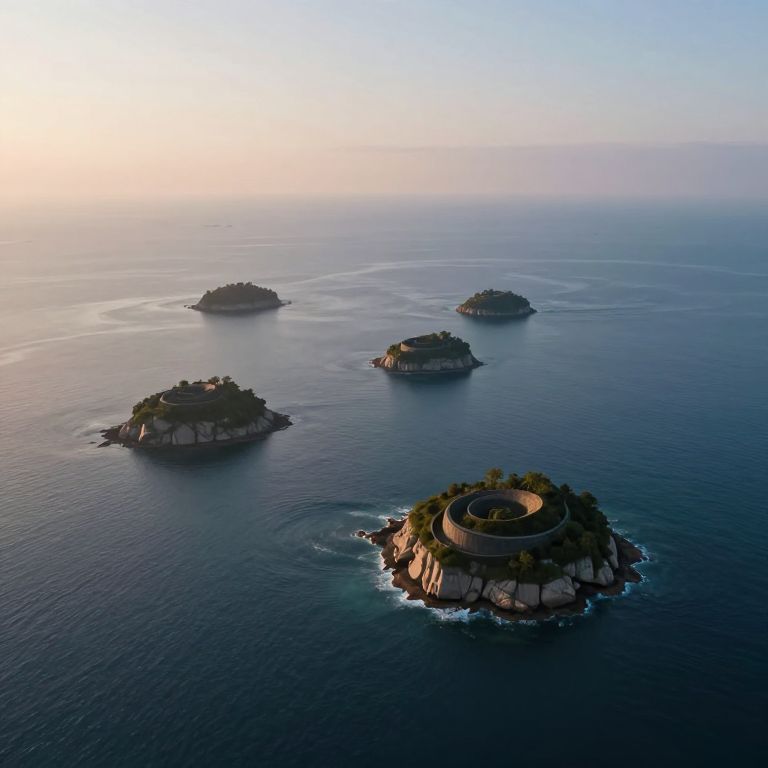 Photograph of a serene seascape at sunrise, featuring four small, circular, rocky islands with lush greenery and stone circular structures, resembling ancient fortresses. The islands are scattered across calm, deep blue ocean water, with gentle waves lapping at their bases. The sky is a gradient of soft pink and blue, with the sun's light casting a subtle glow on the horizon. The islands are positioned in a triangular formation, with the largest in the foreground and the smallest in the background. The overall scene evokes a sense of tranquility and timeless beauty.