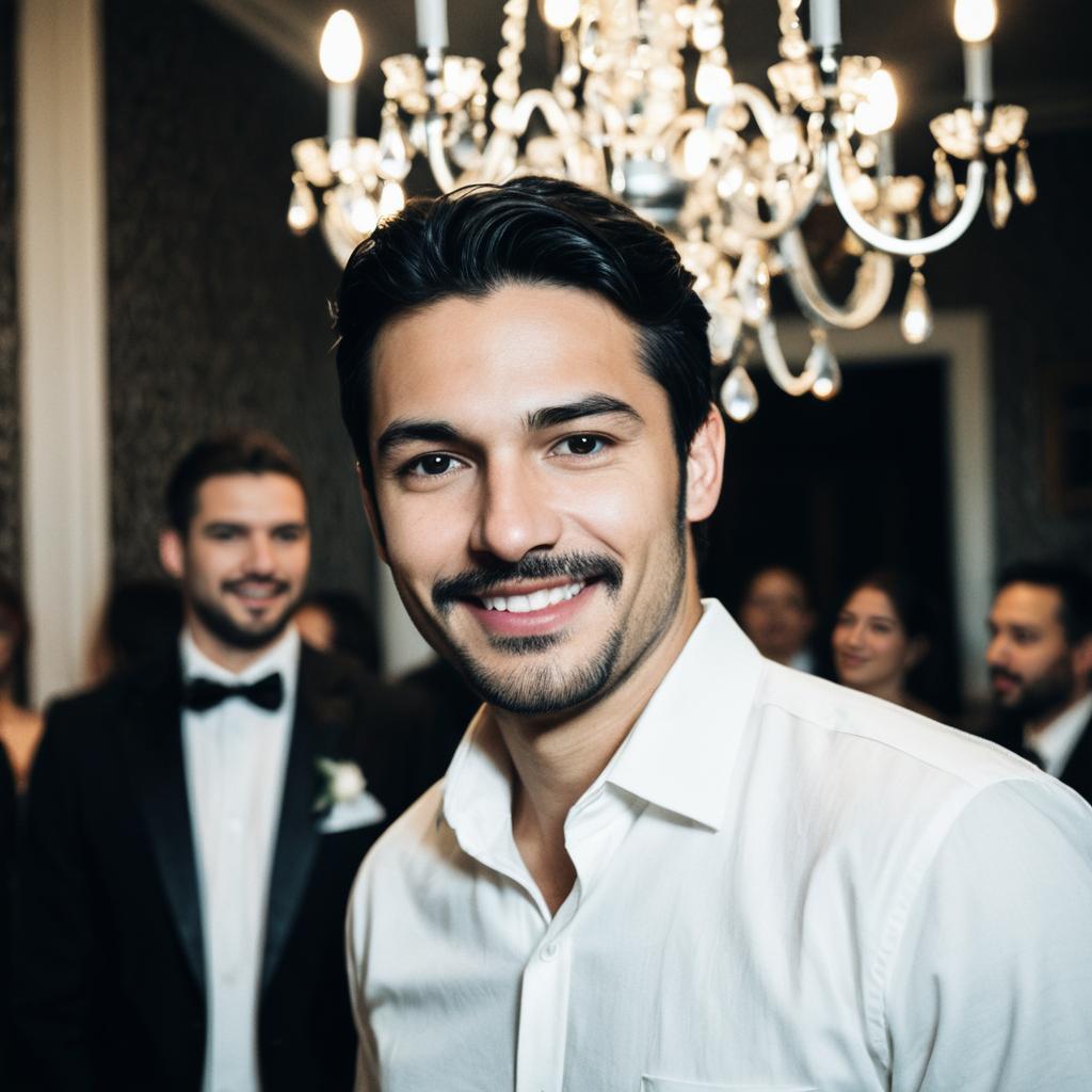 Portrait of a young man with black hair and facial hair, wearing a white shirt, smiling at the camera at a wedding or formal event. The background shows guests dressed in tuxedos and formal attire under a chandelier, with a slightly blurred effect to emphasize the subject.