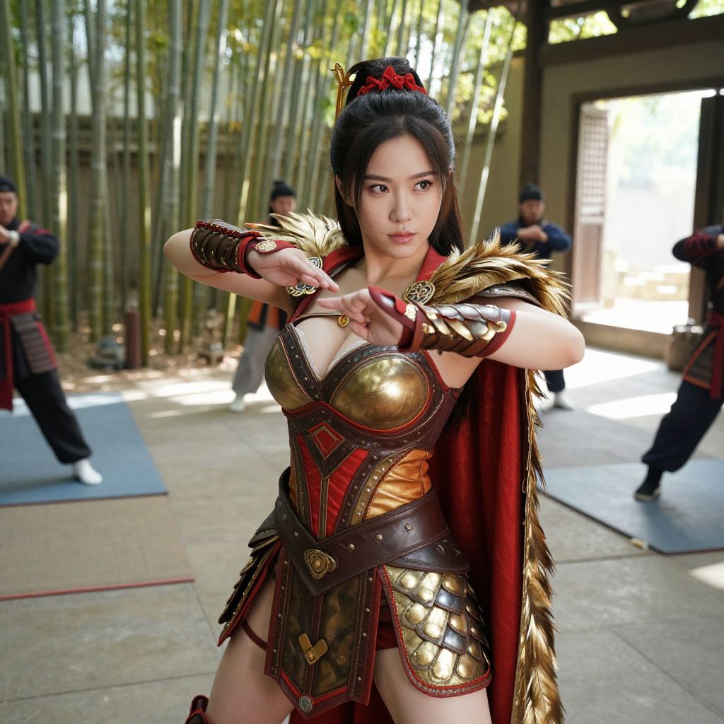 Photograph of an Asian woman in detailed, gold and red gladiator armor, performing a martial arts stance, with bamboo trees and two masked guards in