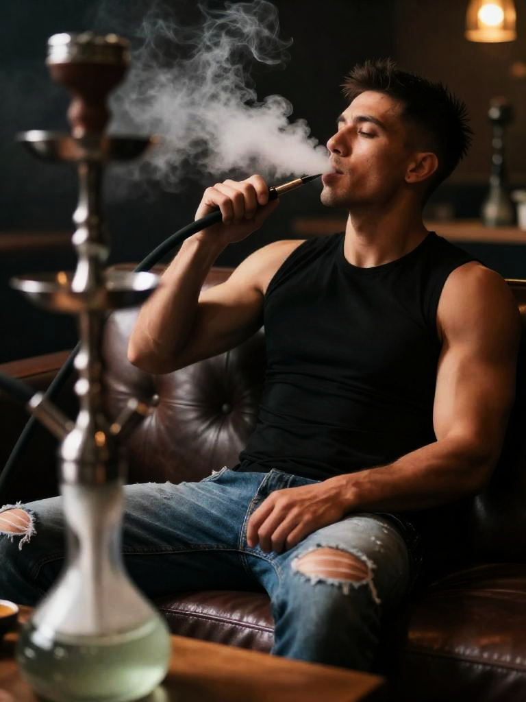 Man smoking shisha, adult man reclining on a leather sofa in a dim lounge, athletic man with short spiky hair and clean-shaven face wearing fitted black sleeveless shirt and ripped jeans, holding the hookah hose close to his mouth as he exhales a thick cloud of smoke, large modern hookah with tinted glass base prominently blurred in the foreground, low depth of field, atmospheric shadows and soft warm highlights, cinematic lifestyle photograph, ultra realistic, high resolution