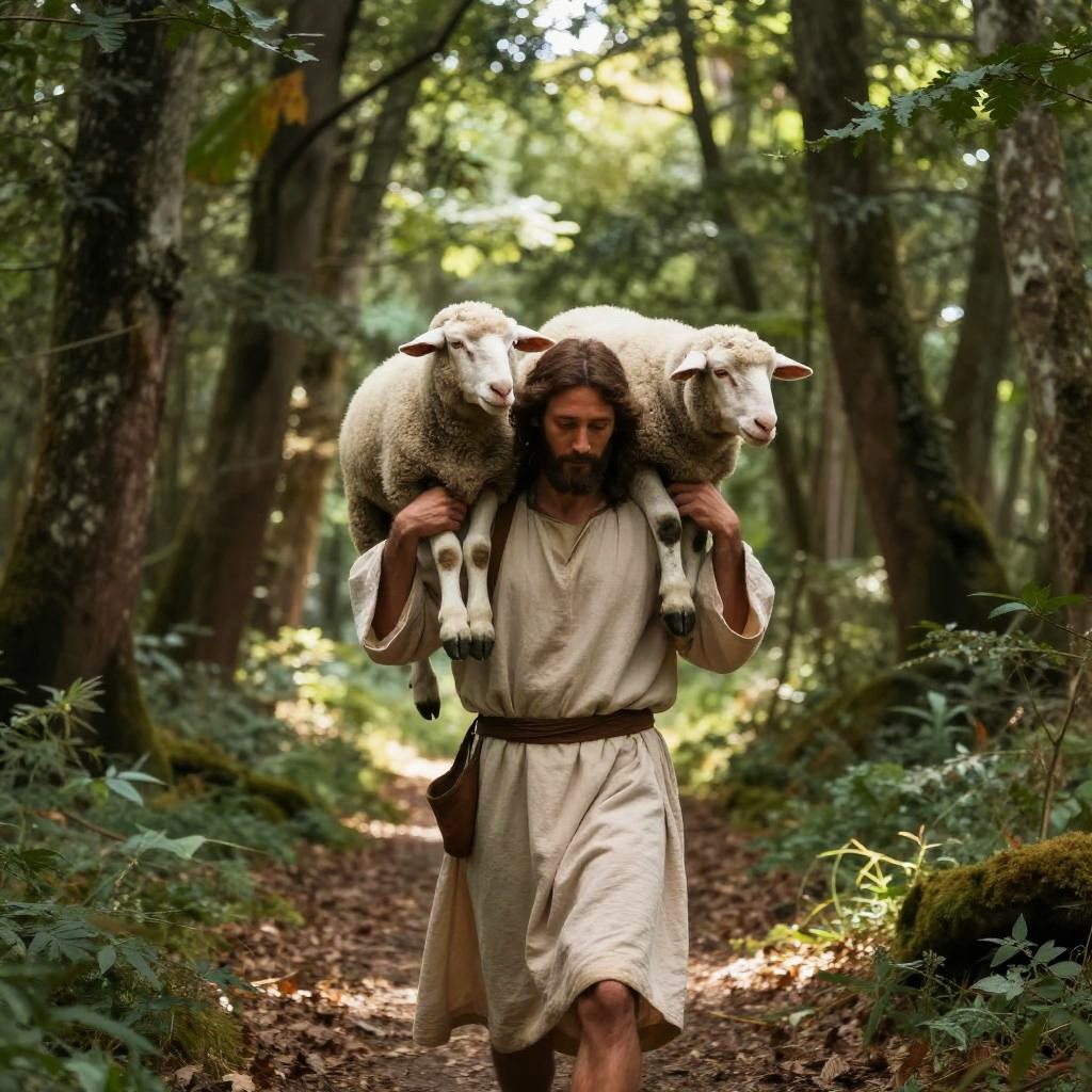 Jesus carrying sheep on his shoulders, walking through a lush forest path with rays of sunlight filtering through tall trees, rich green foliage, detailed natural textures, calm and caring expression, evoking themes of protection and kindness.