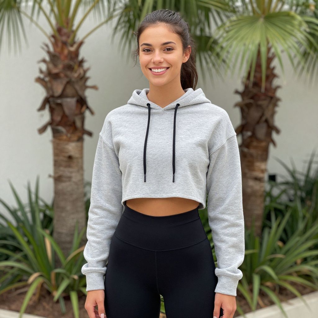 Photograph of a smiling young woman with olive skin and dark brown hair in a ponytail. She's wearing a light gray, cropped hoodie with black drawstrings and black high-waisted leggings. She has a toned physique and stands outdoors in front of palm trees and green plants. The background includes a white building wall. The lighting is natural, and the overall vibe is casual and healthy.