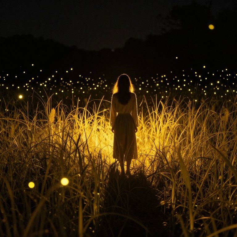 Amidst a field of whispering grass and flickering fireflies, a solitary figure stands bathed in golden light, embodying the quiet wonder of connection between the ephemeral and the eternal.