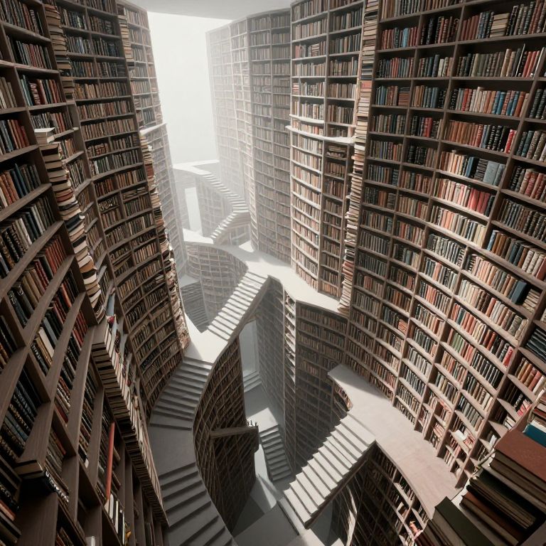 A mesmerizing digital artwork captures the essence of M.C. Escher's visionary style, portraying an architectural wonder where a colossal library ascends into the heavens from a bird's-eye view. The scene showcases countless books stacked in mesmerizing, interlocking patterns that stretch endlessly upwards, creating a sense of vertigo and awe. As the eye follows the structure to the edges of the frame, it transitions into an impossible staircase that seems to defy gravity, ascending infinitely towards an unseen destination. Soft, ethereal lighting bathes the scene, casting elongated shadows that suggest movement and depth, inviting viewers to marvel at the labyrinthine beauty and the enigmatic nature of knowledge hidden within its spiraling confines.