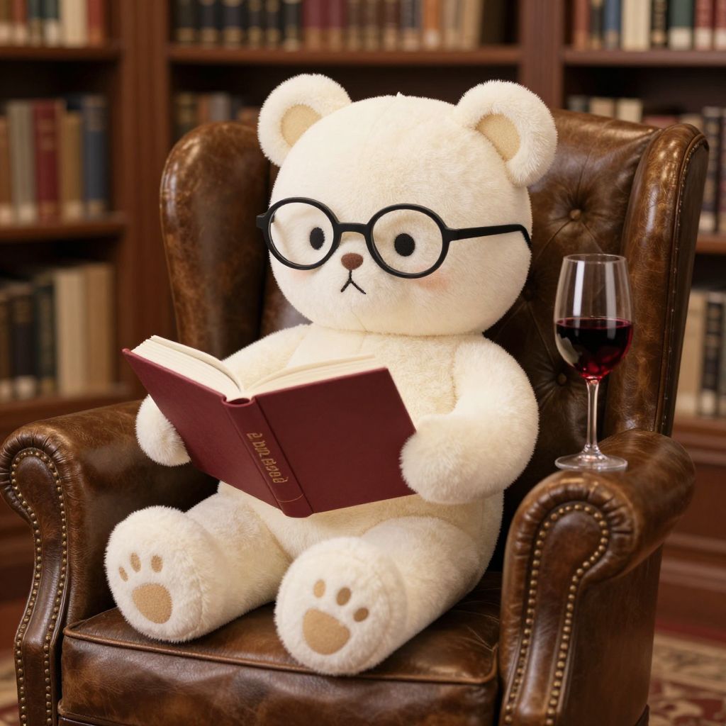 Kawaii Patterns bear with glasses reading a book in a libraby with a glass of red wine elegant in leather armchair,