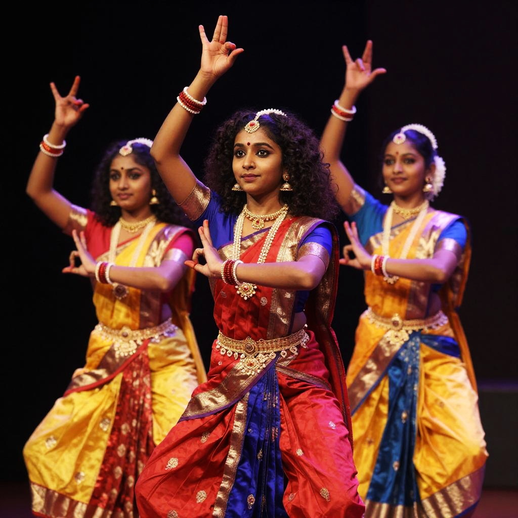 Group of young dancers performing a traditional Polynesian dance on stage at night, wearing colorful island print costumes with shell accessories and grass skirts. The dancers have expressive facial features and curly hair, captured mid-motion with raised hands. Background features a starry night sky, glowing lantern, and musicians playing traditional drums and ukuleles.