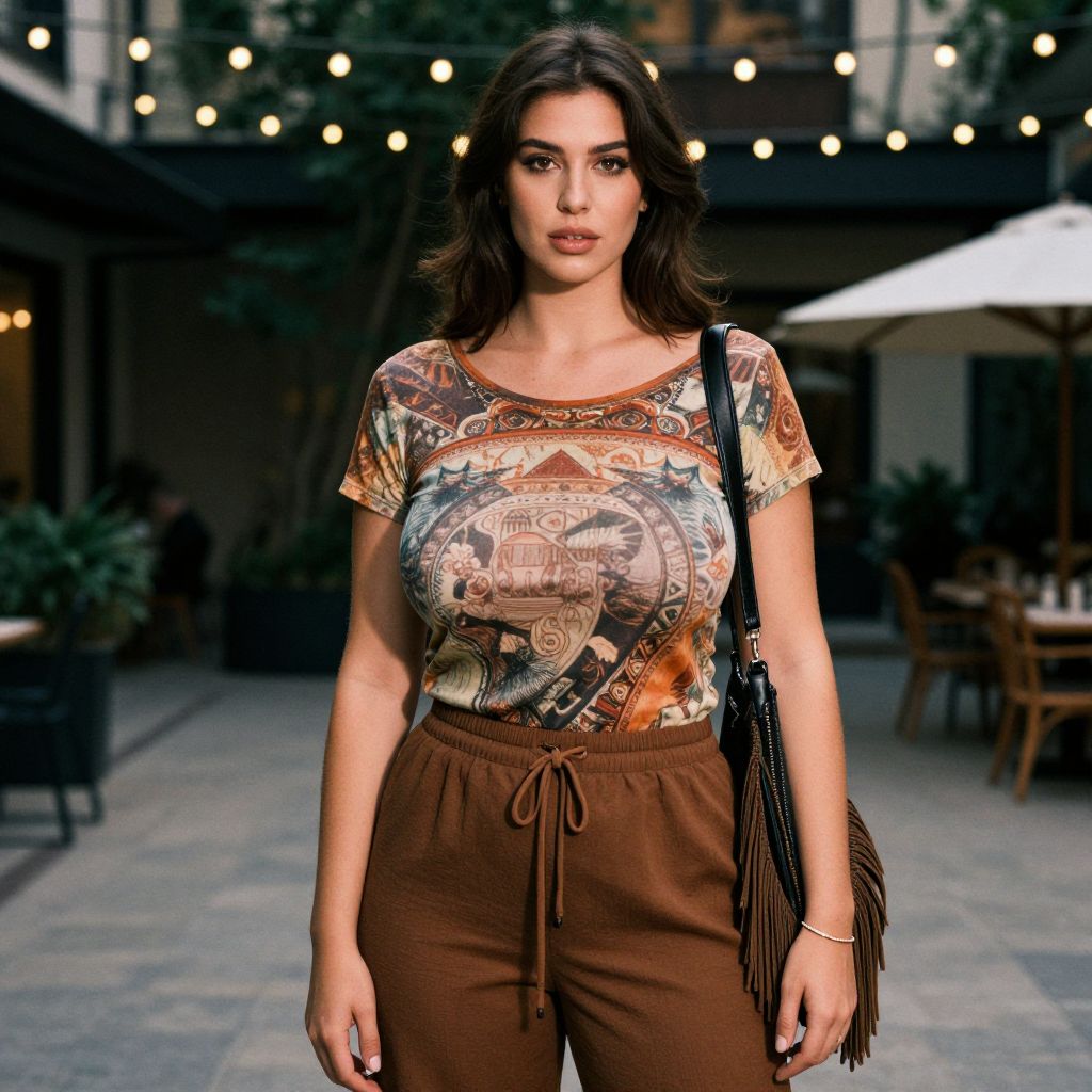 A tall woman in a bohemian, earth-toned printed t-shirt and brown drawstring trousers stands under string lights in a city courtyard, accessorized with a black leather shoulder bag featuring fringe details and a delicate gold bangle on her wrist. Visual style: oversaturated film. Sexy. Pretty face and beаutiful eyes. Big breasts.