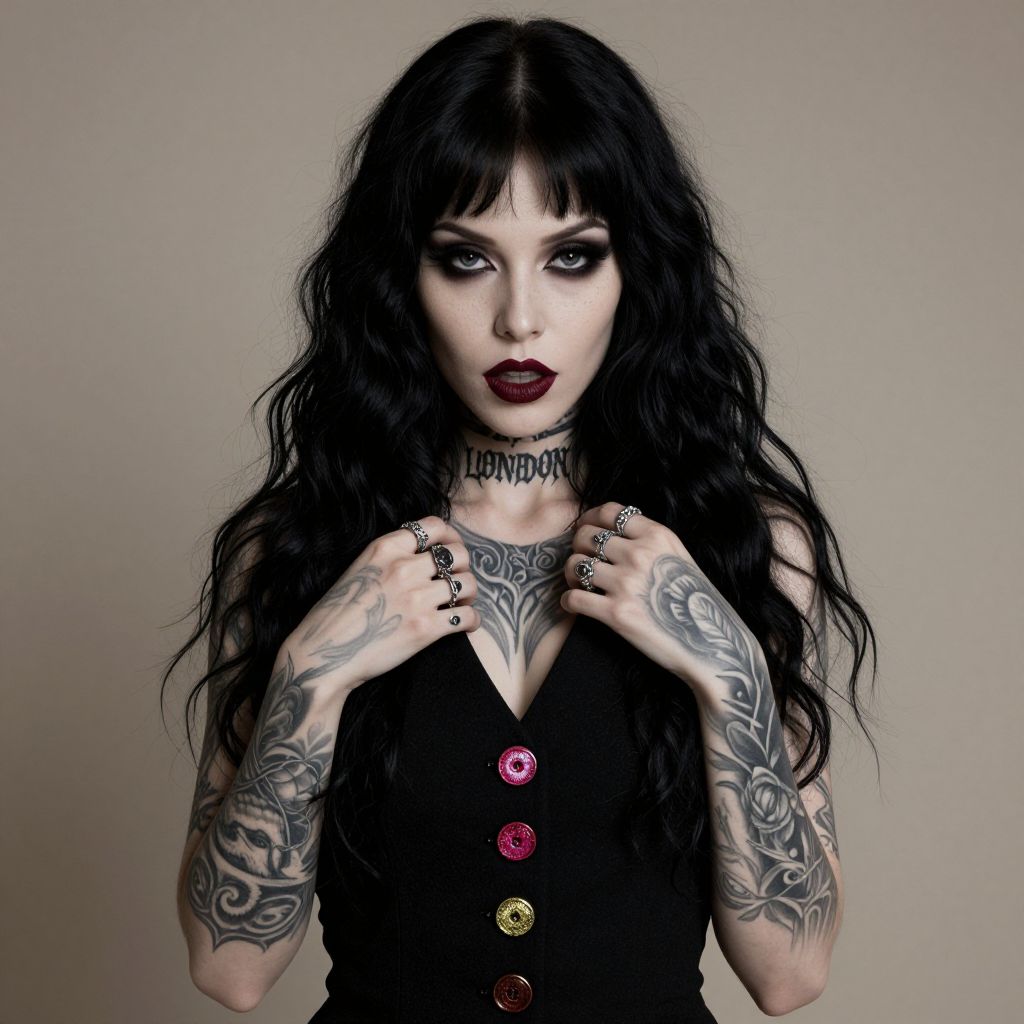 A gothic-style digital portrait of a pale-skinned woman with long, wavy black hair and bangs. She has dark, dramatic eye makeup, freckles, and deep red lipstick. Her arms and neck are covered in detailed black and gray tattoos, including "LONDON" on her neck. She's wearing a black sleeveless vest with colorful buttons and multiple rings on her fingers. The background is a plain beige.