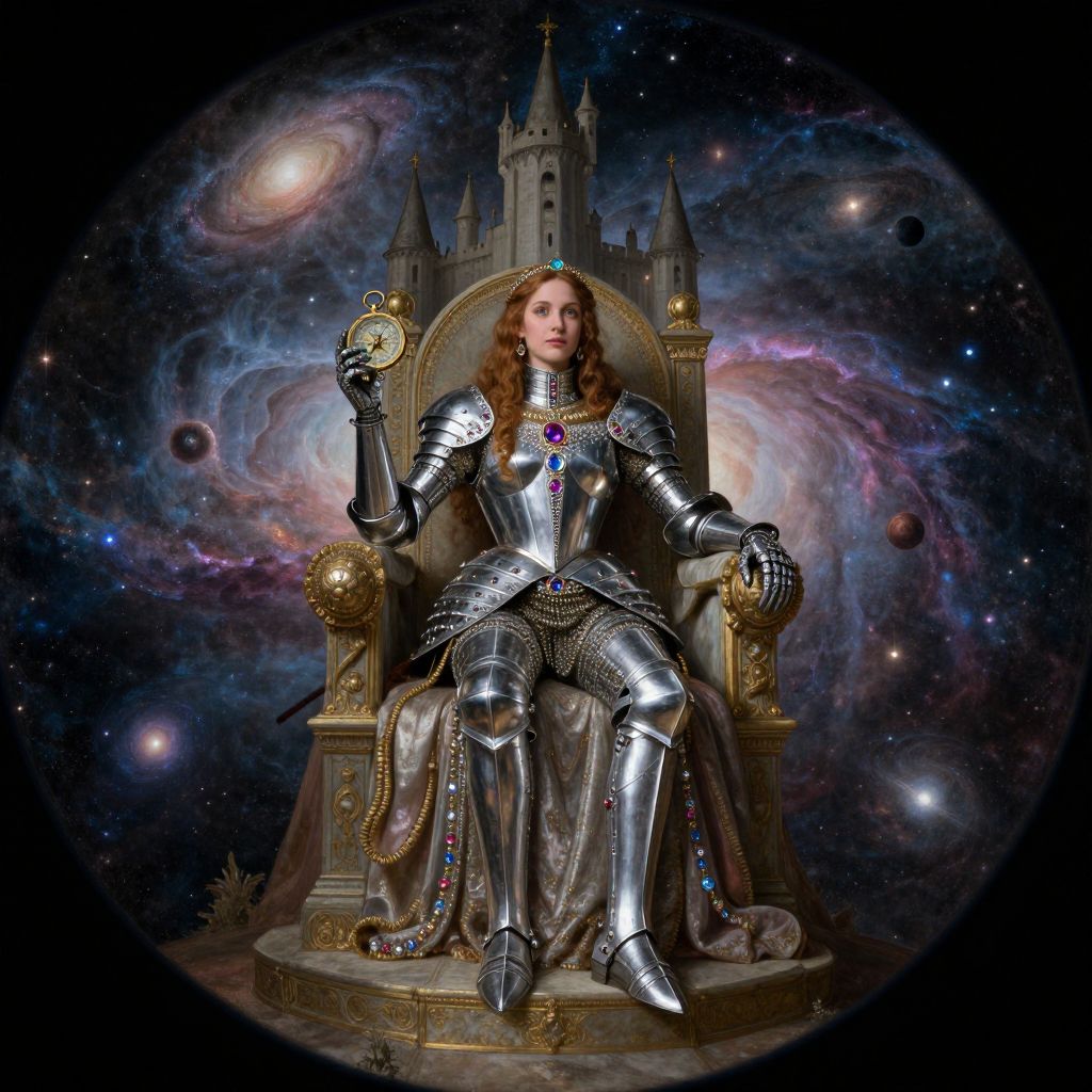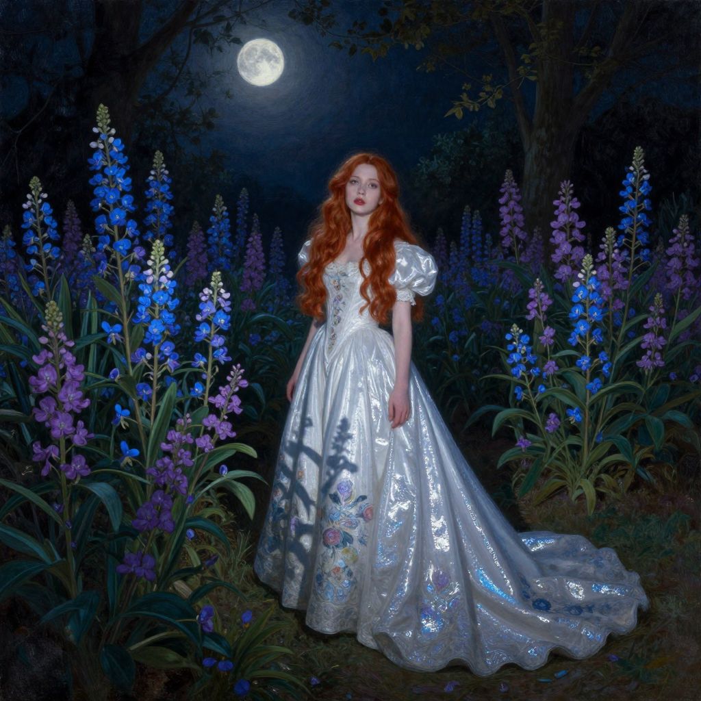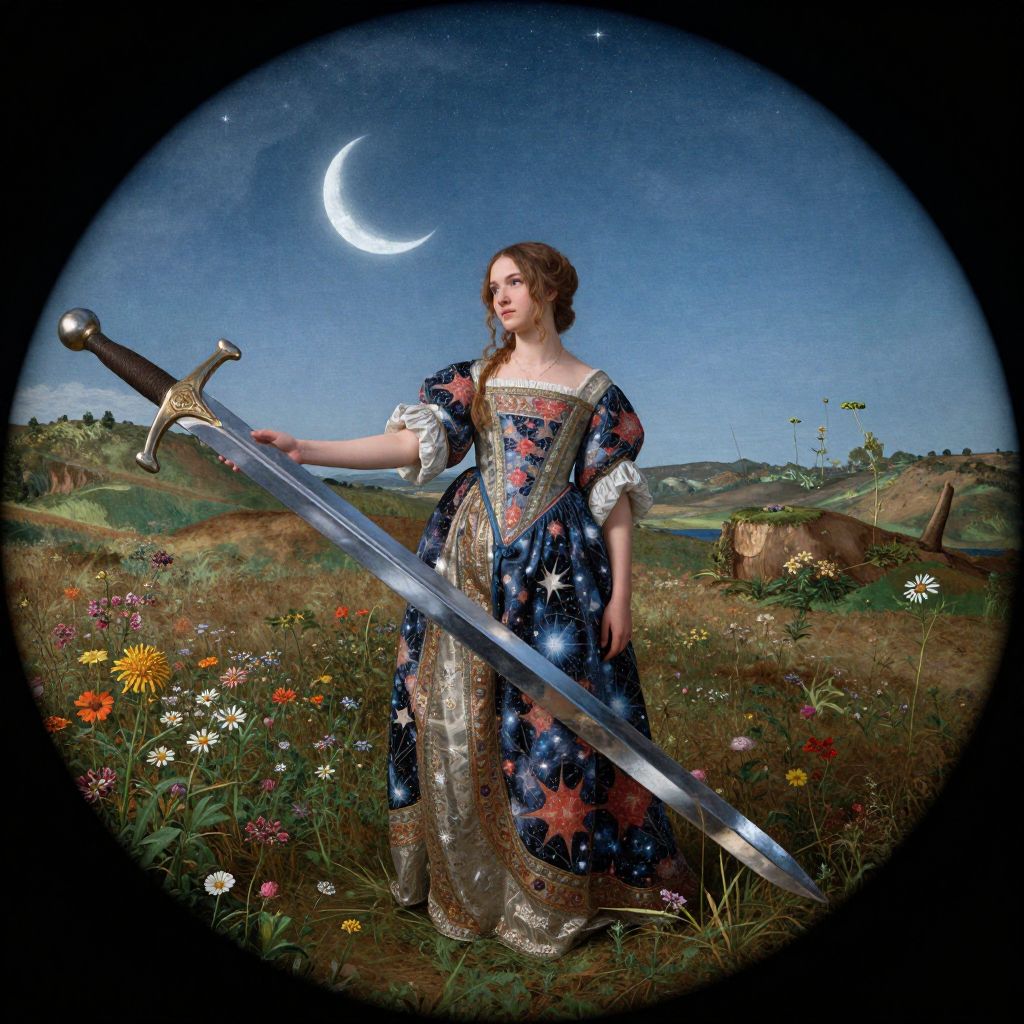 Craft an image embodying the grandeur of Renaissance painting with Baroque nuances. Picture a young woman exquisitely dressed in a gown woven with celestial patterns, standing amidst a vibrant meadow of wildflowers under a starlit sky, bathed in the soft light of a crescent moon. Capture this scene from a unique 'bug's-eye view', as if seen through the lens of a colossal metallic sword that reflects the surrounding landscape, creating mesmerizing patterns and textures on its surface. This perspective not only intensifies the emotional spectrum of awe and wonder but also elevates the scene's ethereal beauty to a level of magnificence.