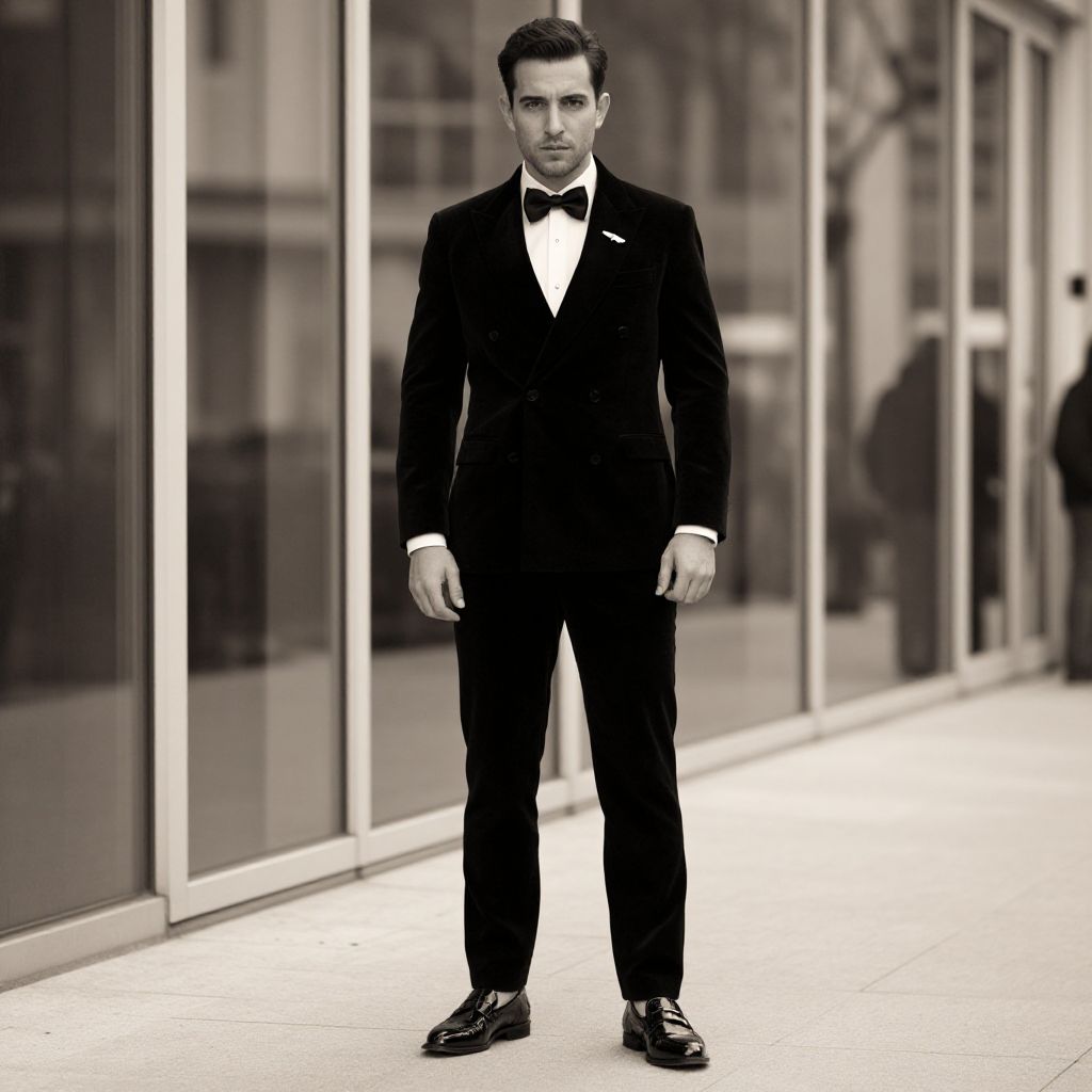 A man, black velvet double vent suit, ivory dress shirt, black satin bow tie, patent leather loafers, subtle silver tie clip, elegant glass facades, sepia effect, confident expression Man has masculine face and piercing eyes