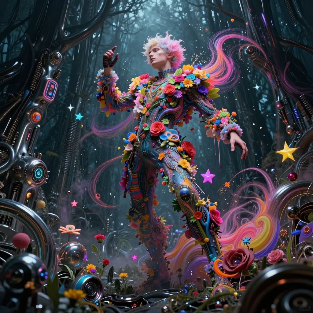 A masculine, magical, ethereal male in a strange and surreal place. Highly detailed, intricate, complex, dynamic pose, award winning design, digital illustration, art by 1007-1227 -D-15, Steven Belledin, Chris Foss, Chris Belle Carl Gustav Fischer and Jean-Baptiste Monge desaturated but vibrant neon color scheme with minimalism and splashing colored stars and wrapped in flowers, science fashion, darksynth, cyberpunk machine, groovy aesthetic, swirly vibrant colors. 8K, (Laurie Lipton), epic composition, a dark forest made out made out of shiny metal, (lawaya that painterly glossy texture:1.33), octane render, photographic, photographic quality render, photorealistic + realistic, dynamic lighting, colourful render, refined, complex objects of thirds, sharp focus, masterpiece, 8K concept art by Dave Demai, -W 1024x3 point of field of many details, (epic scene by Philip Guston and Thomas Kinkade and Thomas Cole Anfree Millaorge:1.56)), excellent composition by WLOP, drooling, crisp, dynamic lights by Syd Mead and Dorian Cleavanger tech by Yuru tanaka