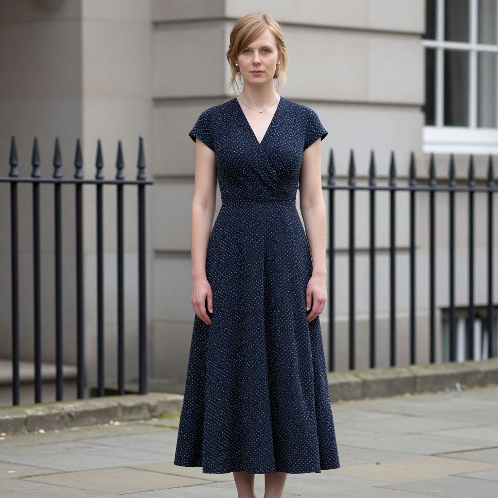 Photograph of a young woman with light skin and shoulder-length, slightly wavy, auburn hair, standing on a city sidewalk. She is wearing a dark blue, short-sleeved, V-neck dress with a subtle polka dot pattern and a knee-length skirt. Her expression is neutral, and she stands with her arms relaxed at her sides. The background features a black iron fence with pointed tops, and a beige stone building with large windows. The sidewalk has light gray tiles with some moss near the street. The lighting is natural, suggesting an overcast day.