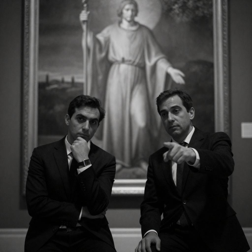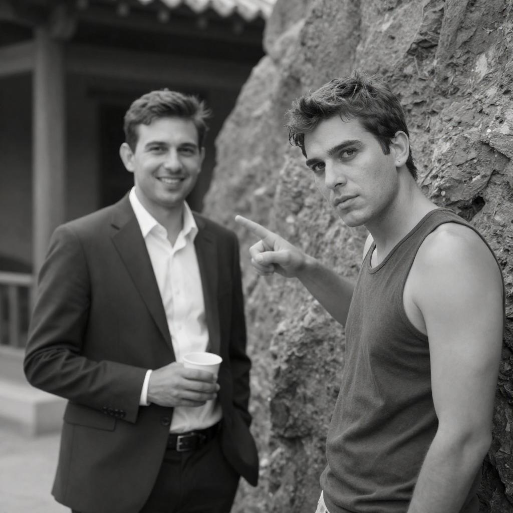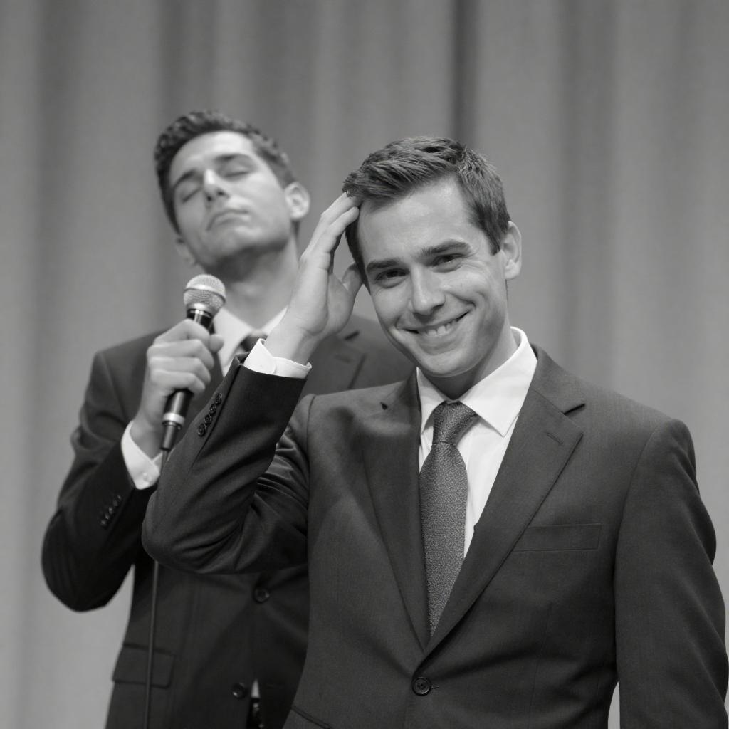 Black and white photograph. Two men in suits with ties. Foreground man smirks, raises hand to touch other man's head. Background man holds a microphone, head tilted back, eyes closed. Curtains in the background.