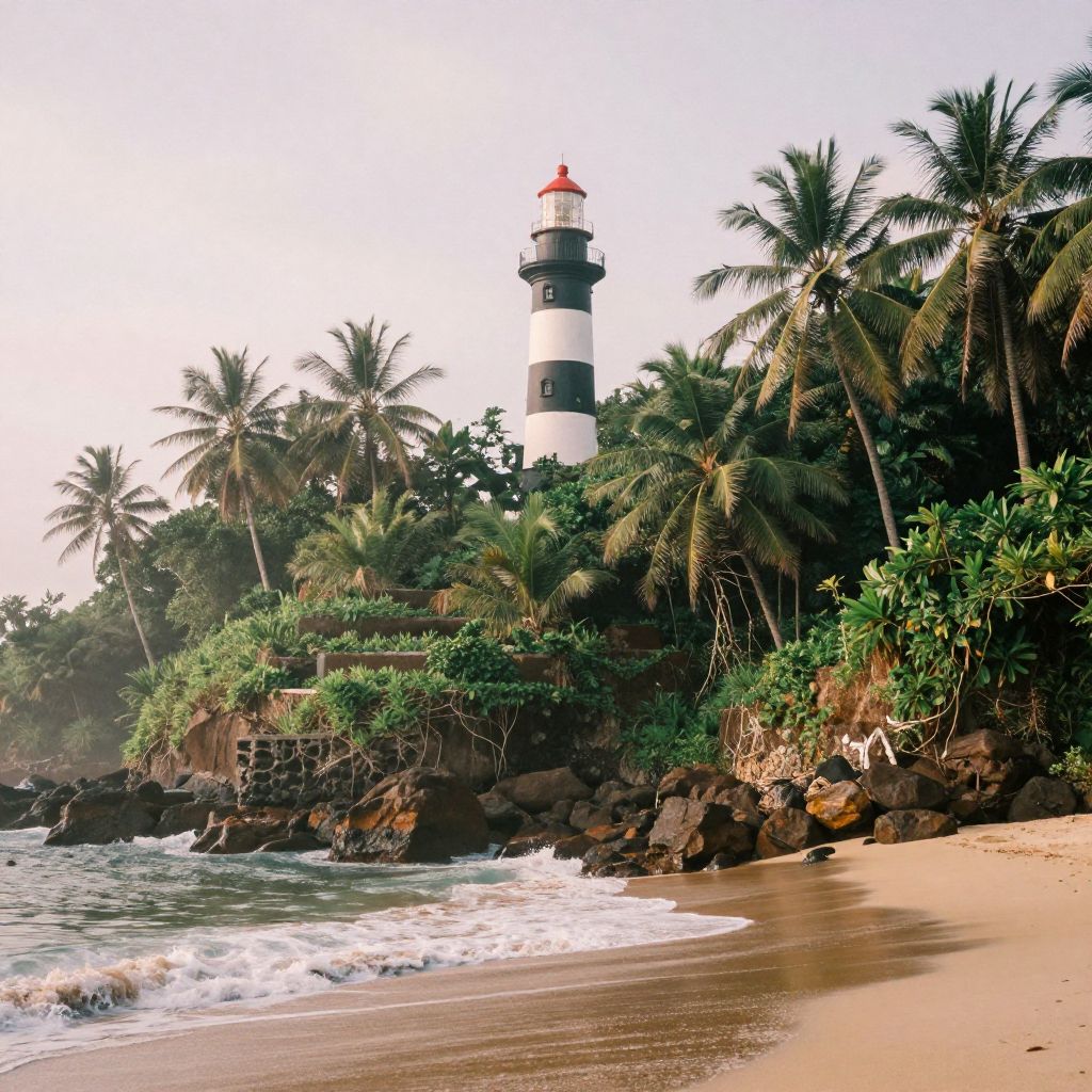 Photograph of a tropical beach scene featuring a tall, black-and-white striped lighthouse with a red roof, situated amidst lush, dense palm trees and green foliage. The lighthouse is positioned on a rocky cliff overlooking a sandy beach with gentle waves lapping at the shore. The sky is clear with a bright, warm light, suggesting midday. The sand is golden and smooth, contrasting with the dark, textured rocks and vibrant greenery. The image captures a serene, picturesque coastal landscape with a focus on the lighthouse and tropical vegetation.