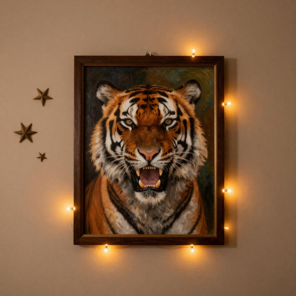 Photograph of two men in blue shirts, seated on a wooden platform, facing a large screen showing a close-up of a tiger's striped back. String lights above, wooden fence in background, night setting. Men's backs to camera, screen center.