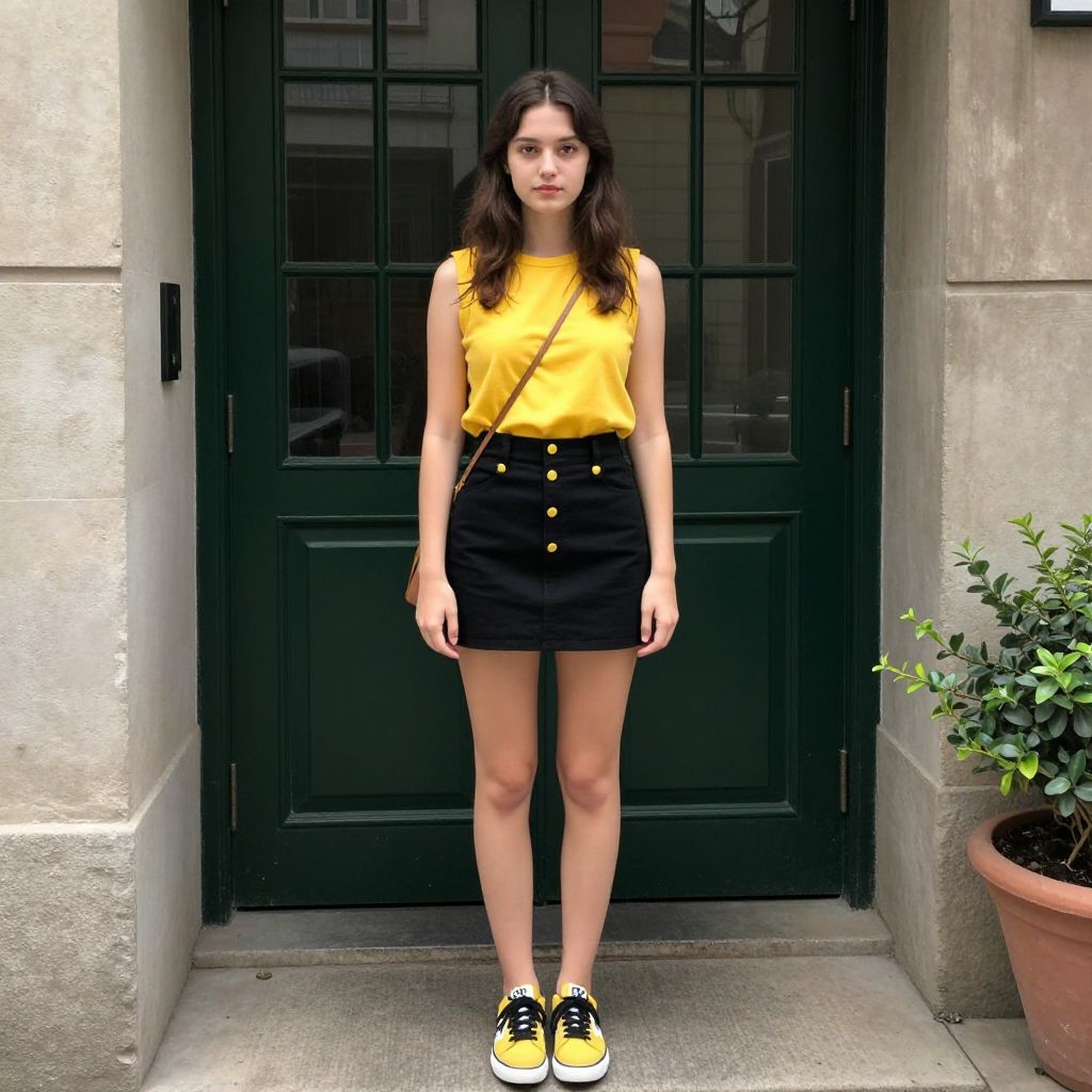 A photograph of a young woman standing in a narrow alleyway. She has long brown hair, fair skin, and is wearing a bright yellow sleeveless top, black high-waisted mini skirt with yellow buttons, and yellow sneakers with black laces. She carries a brown crossbody bag and stands confidently in front of a dark green door with glass panes. A potted plant is on the right.