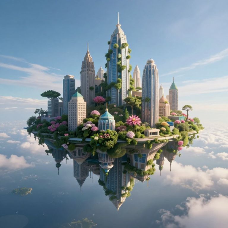 Suspended between earth and sky, a surreal metropolis of blooming towers ascends into the heavens, where gravity bends to the will of nature, evoking a dreamlike serenity that whispers of infinite possibility and the eternal dance between humanity and the natural world.