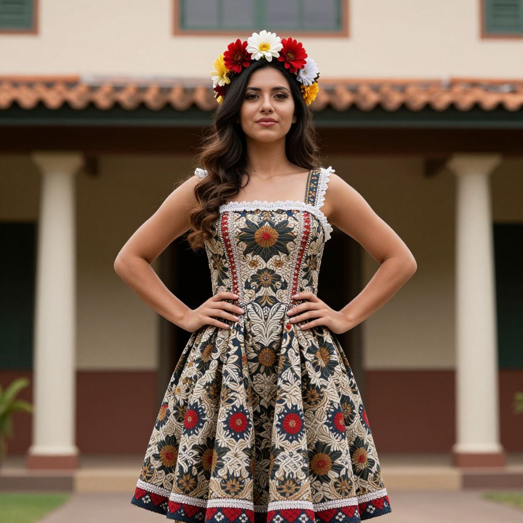 Australiana costume, woman in a dress with a flower crown standing in front of a building