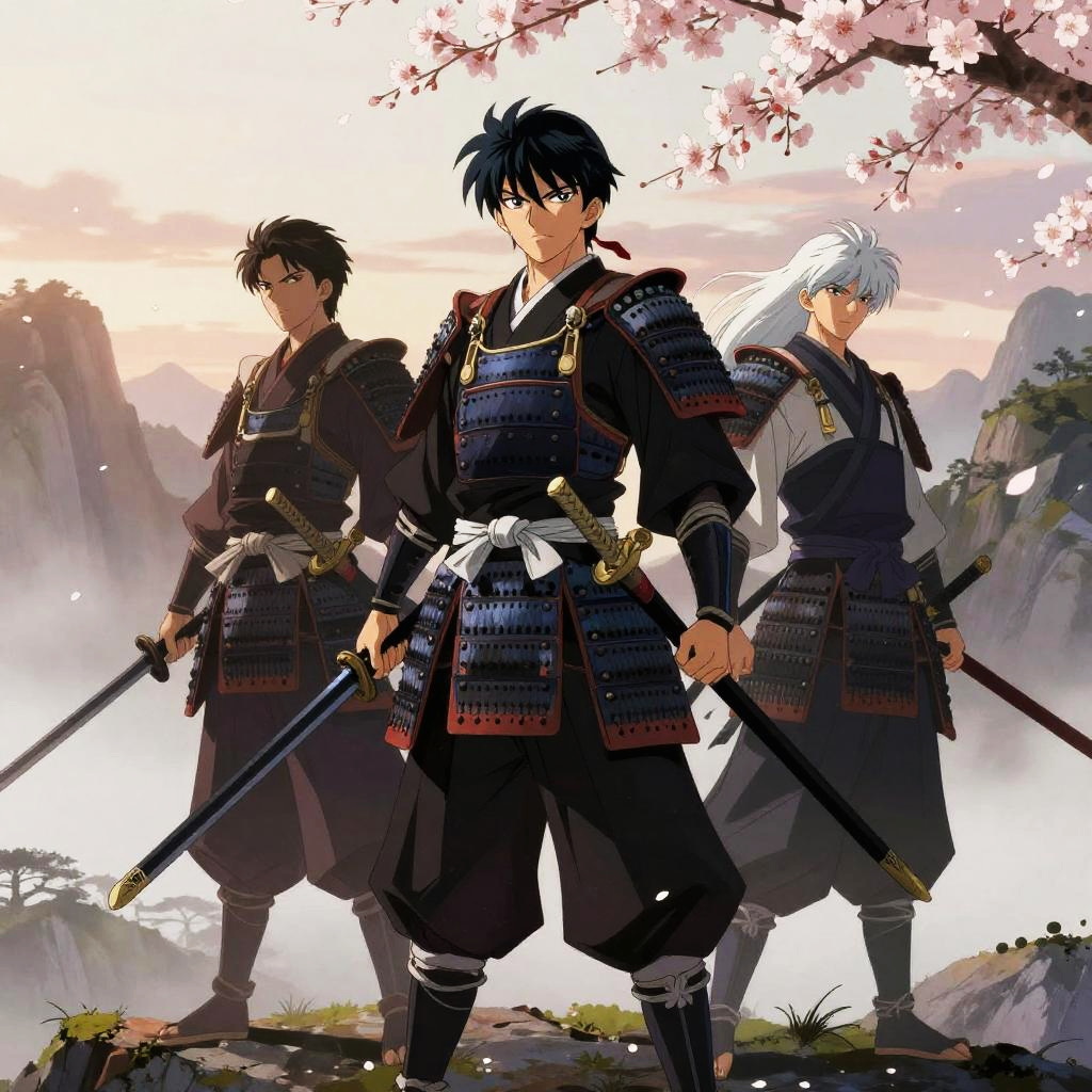 Anime-style digital artwork of three samurai standing back-to-back under cherry blossoms, holding swords, with misty mountains in the background.