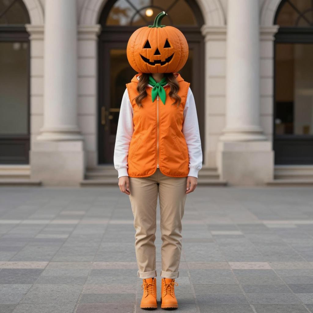 Full body shot of an adult woman wearing a pumpkin head costume, an orange hooded vest, a green neckerchief, beige pants, and orange boots. She has long brown hair and stands on grey pavement in front of a building with arched doorways. The setting suggests an urban environment during autumn or fall daylight with natural lighting.