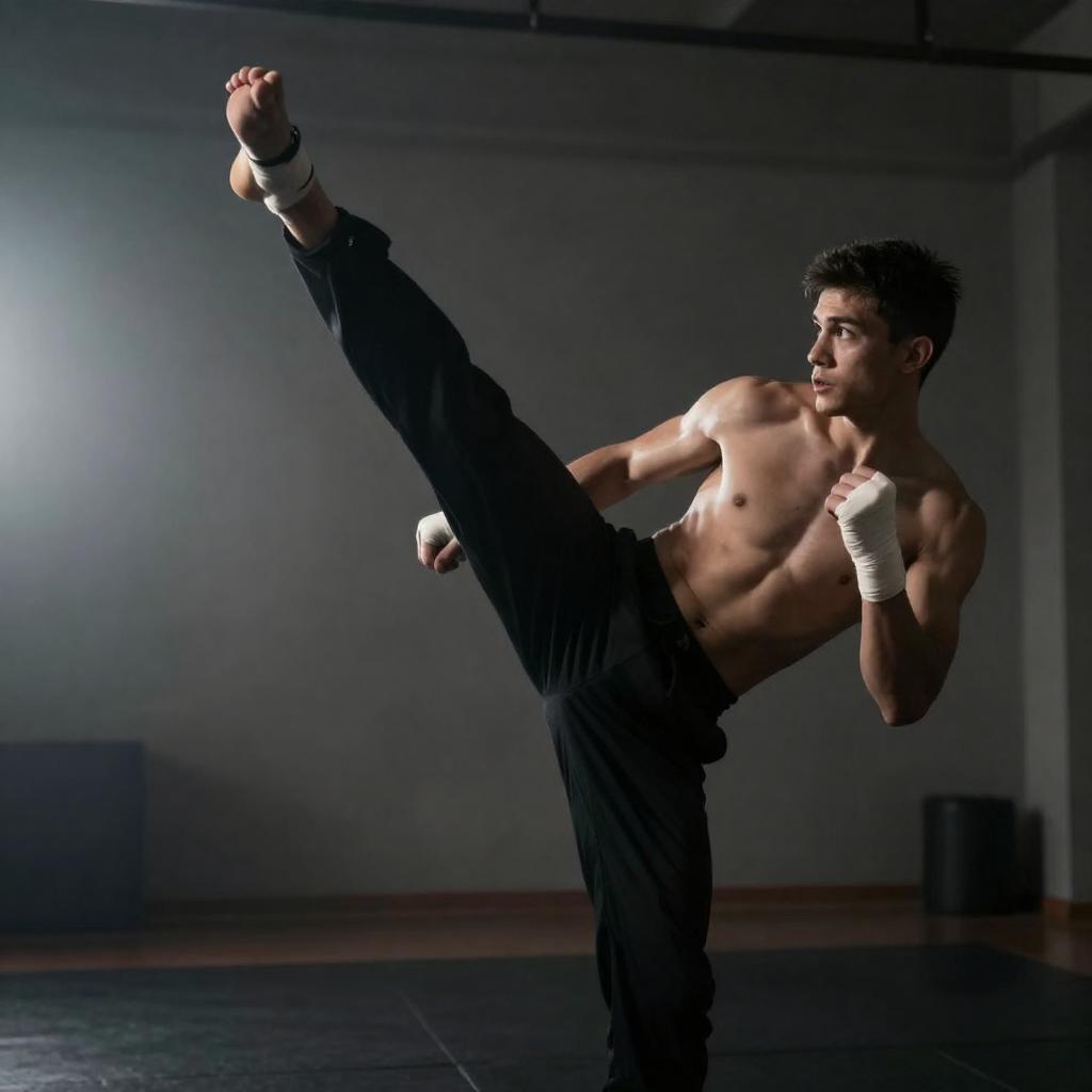 Two shirtless male fighters, one in red pants, one in blue with yellow trim, mid-air kickboxing. Ball between them. Blue fighter's muscular, dark-skinned, intense expression. Red fighter's lighter-skinned, focused. Background is a gradient of light gray.