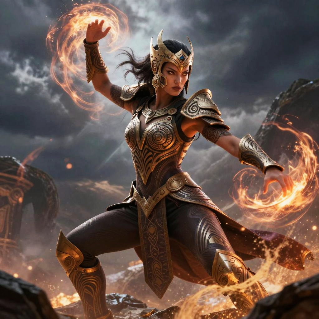This digital art image features a powerful female warrior with dark skin, long black hair, and intense eyes. She wears intricately detailed, metallic armor adorned with ornate patterns, and a gold crown with horns. She is in a dynamic, combat-ready stance, with one arm raised, conjuring a swirling ring of fire. Her other arm is extended forward, also controlling a flame. The background shows a dark, stormy sky with dramatic lighting and broken stone structures, adding a sense of chaos and battle. The image is highly detailed, with a focus on the warrior's fierce expression and the dynamic movement of the flames.