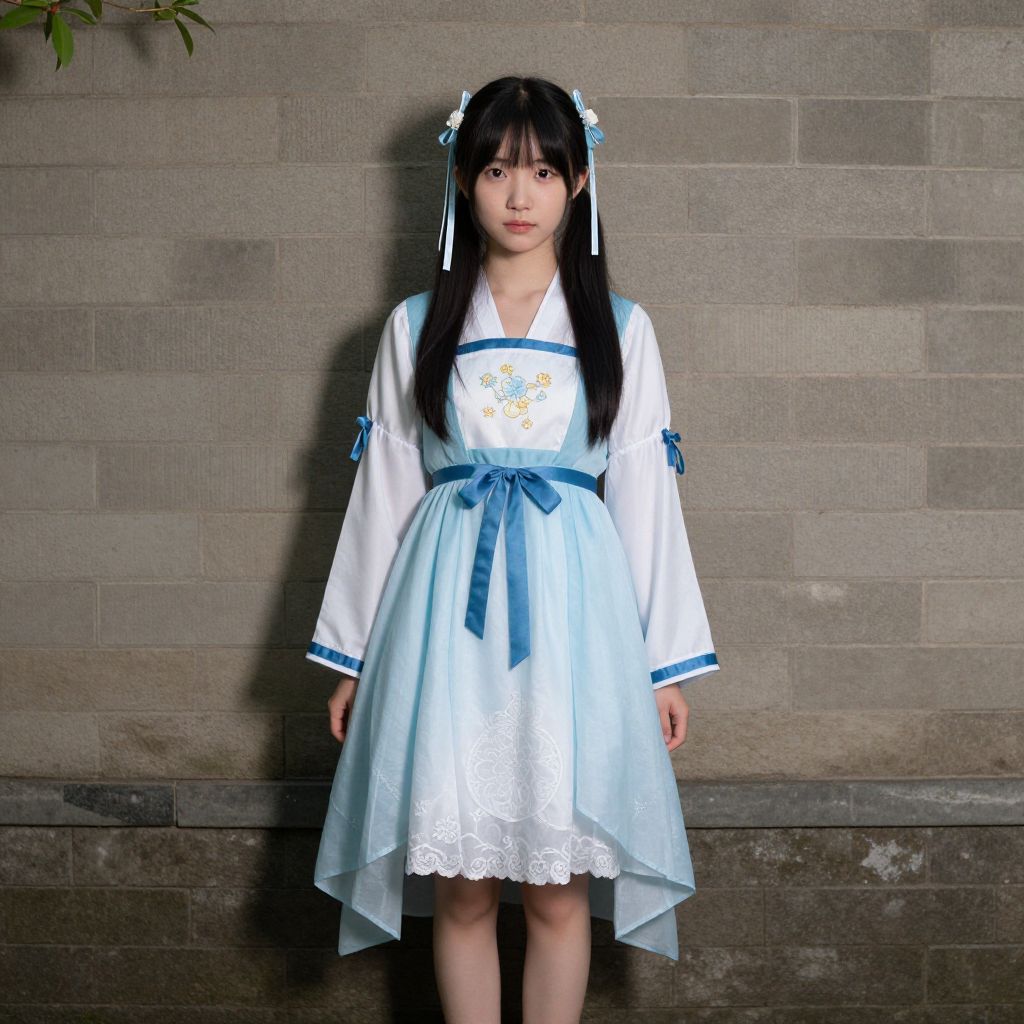 Photograph of an Asian girl with long black hair, wearing a white and blue hanbok dress with lace trim, blue ribbon, and hair ornaments