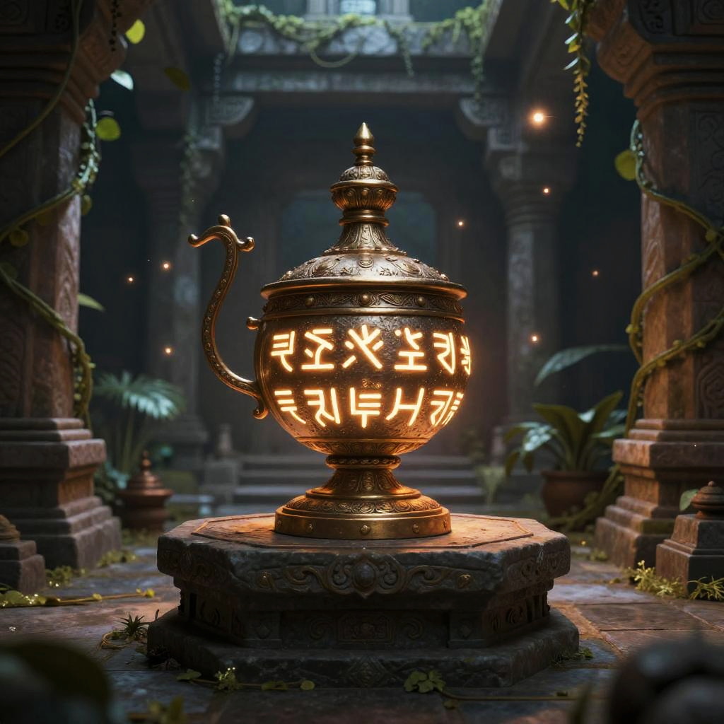 An ornate mashal embedded with glowing runes, resting on a stone pedestal in a forgotten temple, surrounded by lush vines and magical floating particles, warm ambient light contrasting cool shadows, fantasy realism style.