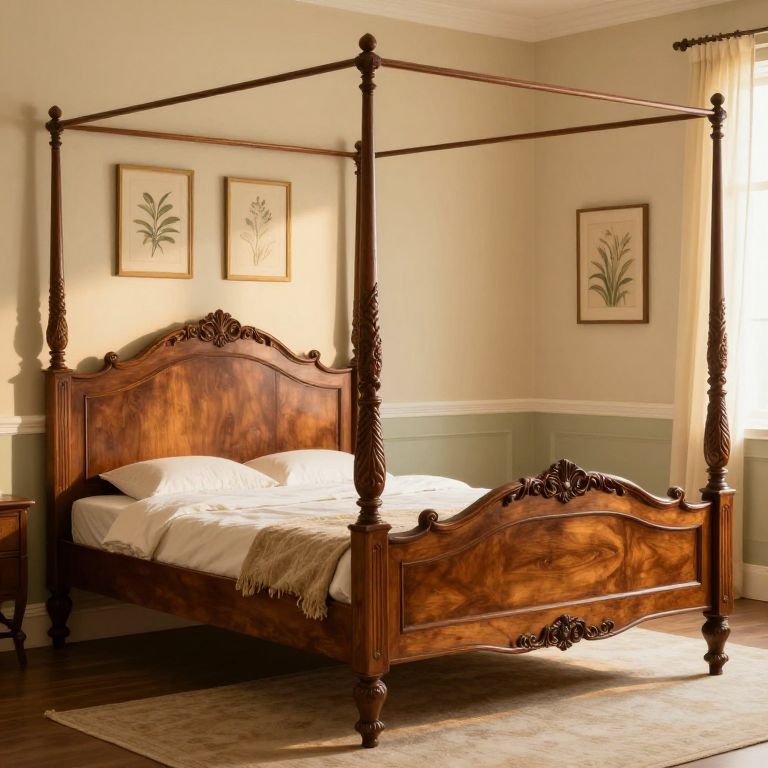 A vintage-inspired, antique queen bed frame with a classic four-poster design, featuring rich wood tones and intricate carvings, set against a shabby chic backdrop with soft pastel walls, framed botanical artwork, and warm, golden-hour lighting that enhances its romantic and rustic charm.