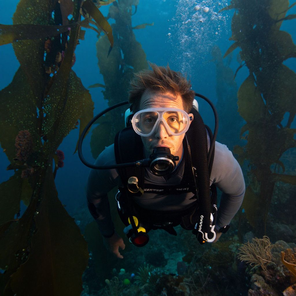 Create an ultra-realistic portrait from an underwater perspective, capturing the enigmatic gaze of a deep-sea diver illuminated by ethereal, bioluminescent light filtering through a kelp forest. The scene should evoke a sense of serene tranquility and wonder; golden hour sunlight casts long shadows across the diver's face, highlighting their determined expression amidst the mysterious depths. Pay meticulous attention to textures, such as the wrinkled skin and well-worn diving suit, while seamlessly blending in vibrant hues from the surrounding marine life and vegetation. Craft an atmospheric visual narrative that bridges the human experience with the mystical allure of the underwater realm, capturing both the diver's tranquility and their determination to explore the unknown depths.