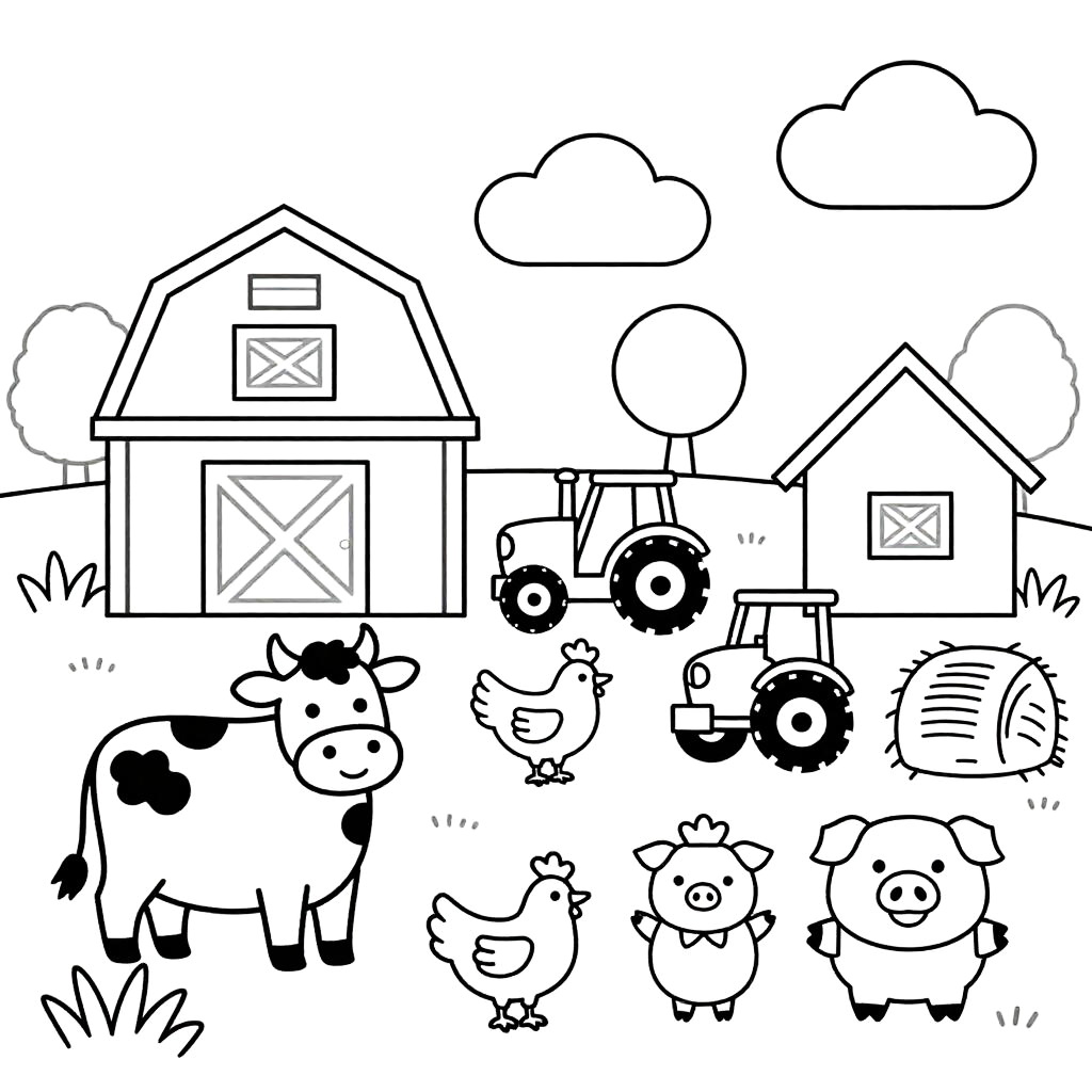 Children's coloring pages of a busy farmyard scene with cheerful farm animals such as cows, chickens, and pigs, large shapes and simple patterns, barns, tractors, and hay bales, designed to spark imagination in young children.