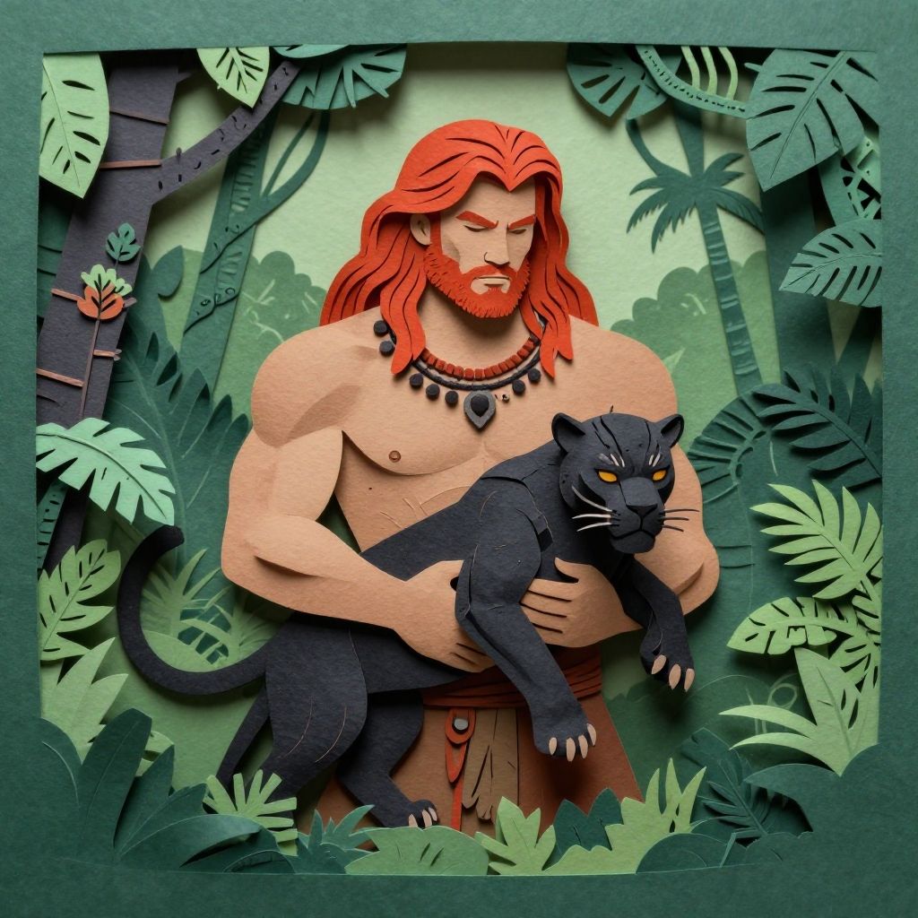 Paper cut papercraft style, telling the story of a muscular, redhad male holding black panther lost in a lush jungle, fantasy illustration, detailed illustration, stunning detailed picture, ethnik, art by greg rutkowski and artgerm, soft cinematic light, adobe lightroom, photolab, hdr, intricate, highly detailed, (depth of field:1.4)