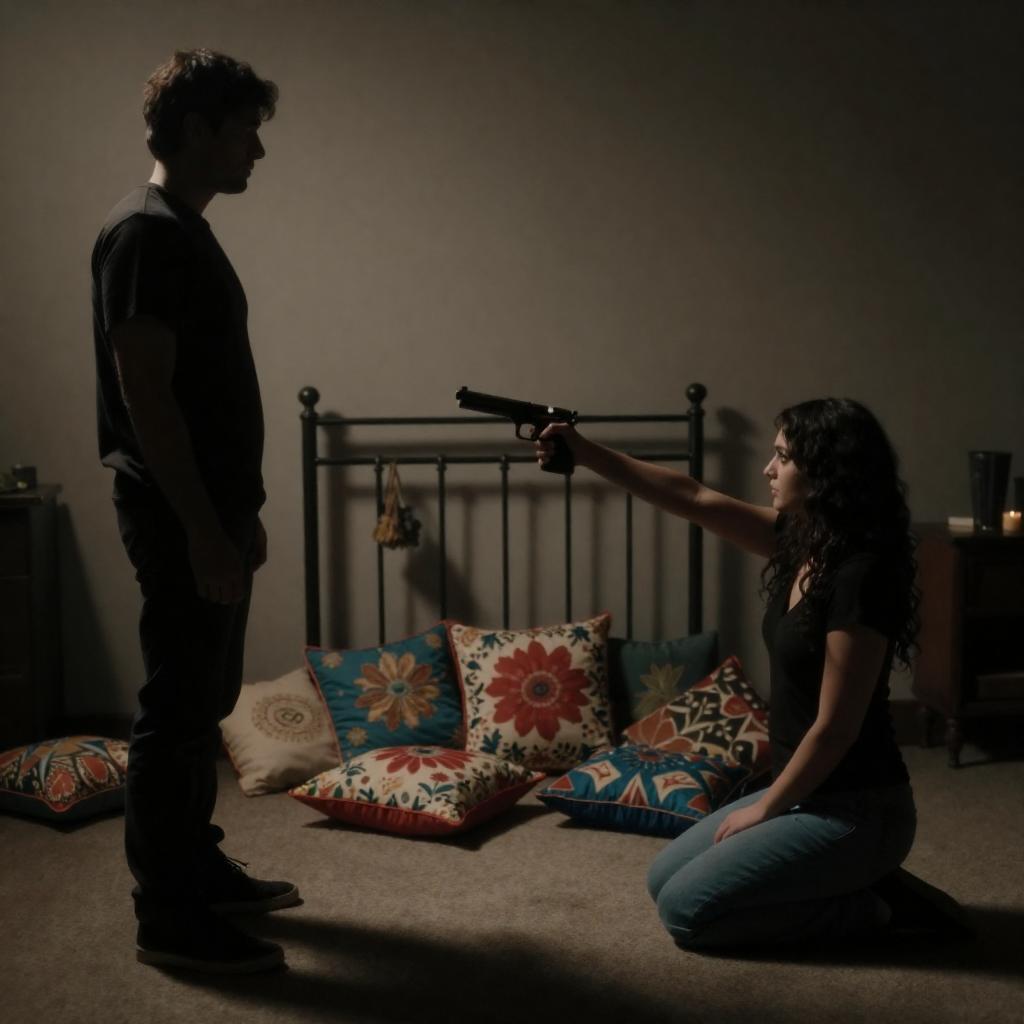 A photograph of a silhouetted man and woman in a dimly lit room, pointing guns at each other. The woman kneels on the floor, surrounded by colorful, floral-patterned pillows. The man stands to the left, casting a shadow. The background includes a metal headboard with hanging decorations.