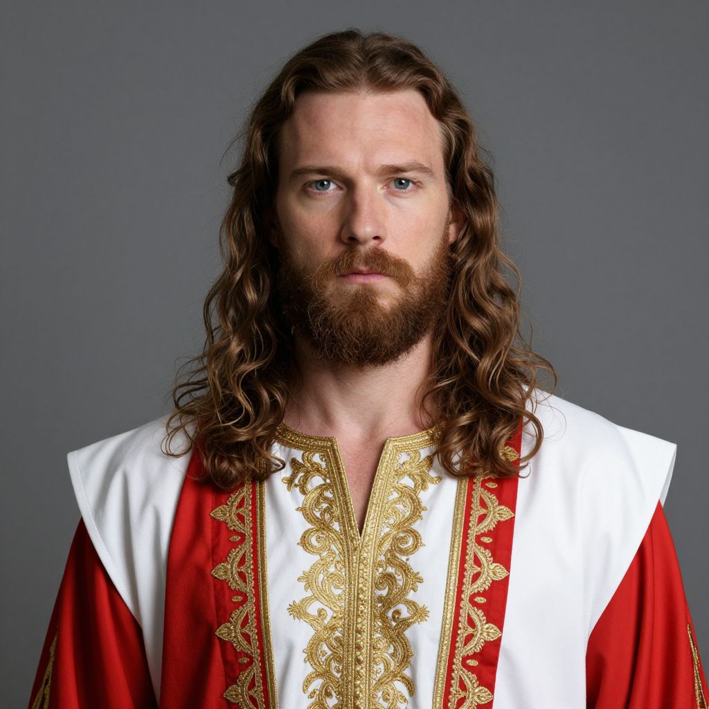 Photograph of a white man with long, wavy brown hair and a full beard, wearing a red and white robe with intricate gold embroidery. The robe has white shoulder pieces and a gold-embroidered front. He has blue eyes and a serious expression. The background is a plain gray, making him the focal point. The lighting is even, highlighting the details of his attire and facial features.