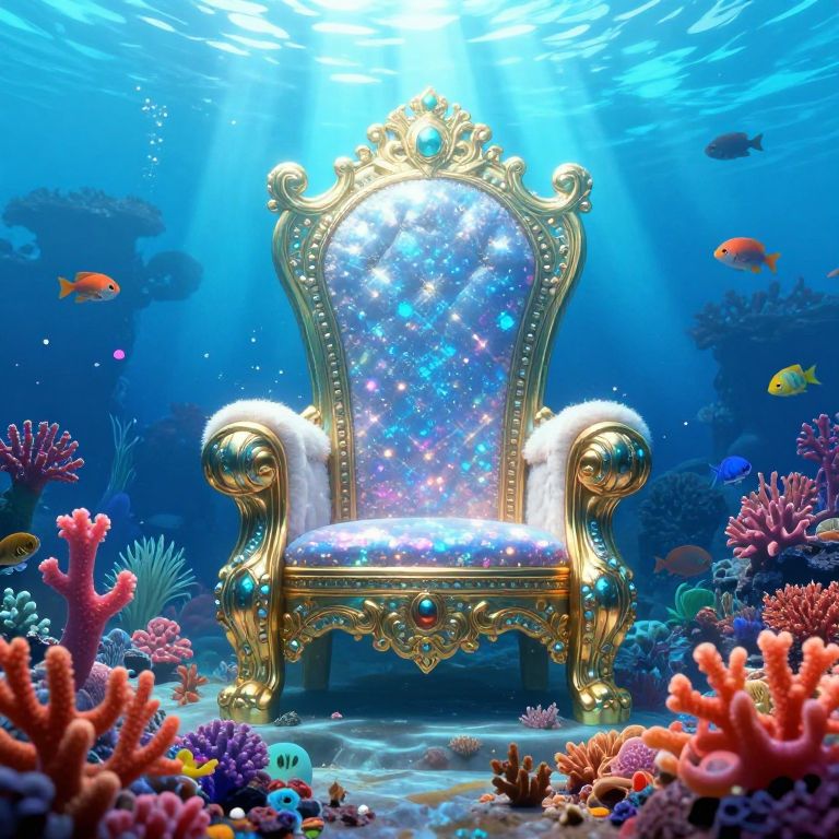 A vibrant, digital illustration depicts an ornate, golden throne with a starry, galaxy-like cushion, set underwater. The throne, adorned with intricate carvings and glowing blue gemstones, stands amidst colorful coral reefs, including pink, orange, and purple coral. Bright sunlight beams from above, illuminating the scene and creating shimmering reflections on the throne. Various fish, including orange and yellow, swim around the throne, adding to the fantastical underwater setting. The background is a deep blue, gradually fading into darkness, with scattered bubbles and gentle currents. The overall style is whimsical and fantastical, blending elements of fantasy and underwater exploration.