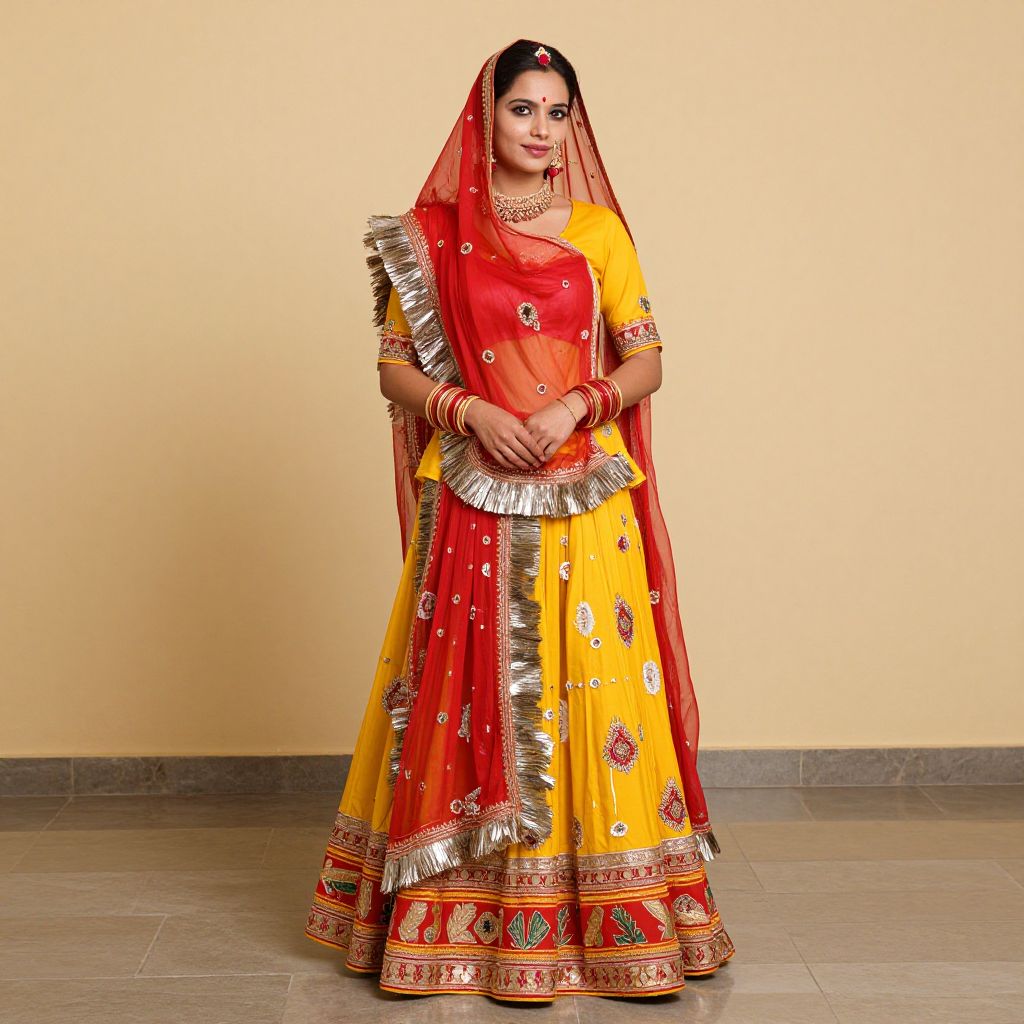 Rajasthani Lehenga Costume, a woman in a red and yellow sari standing on a stone floor