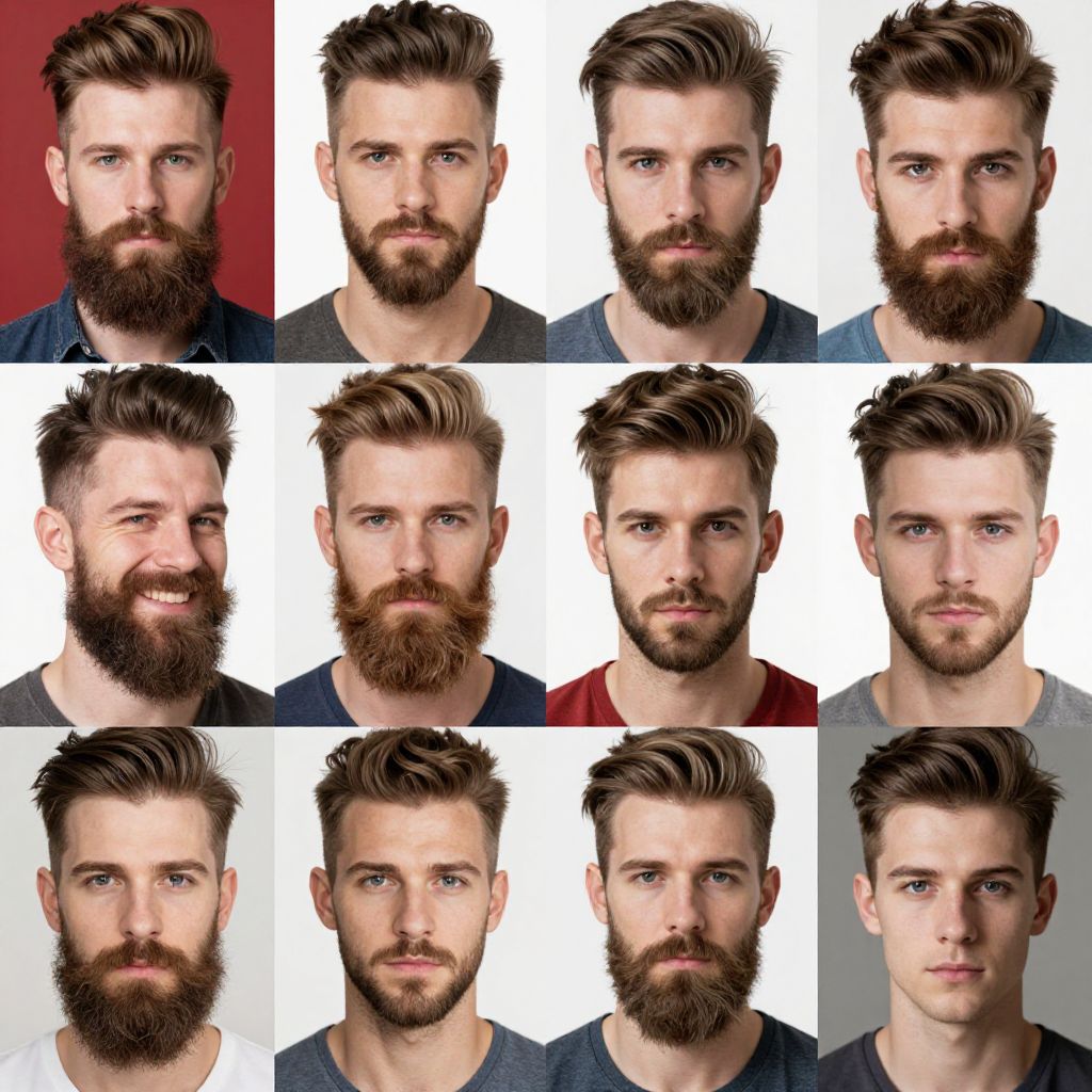 Beard styles images featuring trendy and creative facial hair arrangements on diverse male models, displayed with sharp detail and vibrant colors, studio background, highlighting different beard lengths, textures, and maintenance techniques.