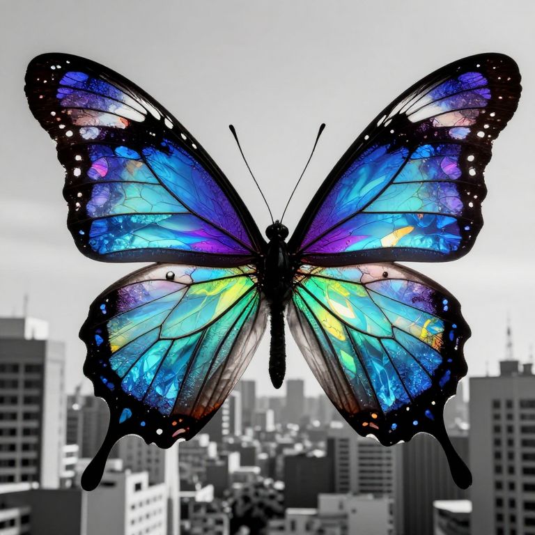 Vibrant, multicolored butterfly with iridescent blue, purple, and green wings silhouetted against a grayscale cityscape background.