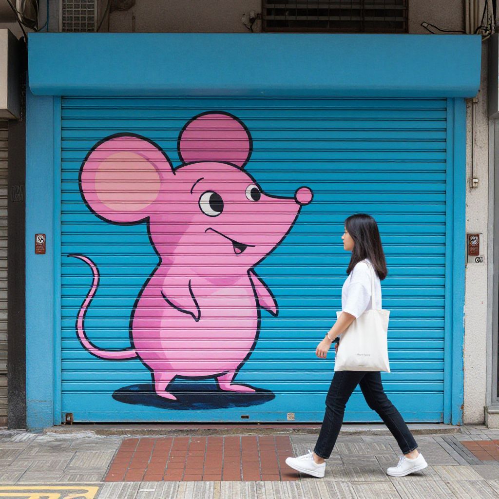 A vibrant cartoon-style mural of a cheerful pink mouse adorns a blue metal shutter in Hong Kong, blending playful street art with urban charm as a woman walks past, carrying a tote bag, showcasing the city's dynamic blend of creativity and everyday life.