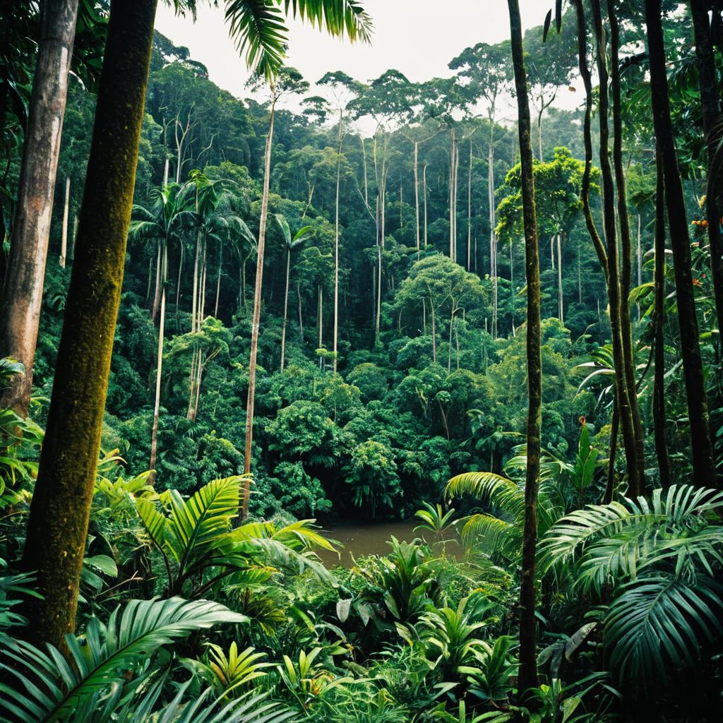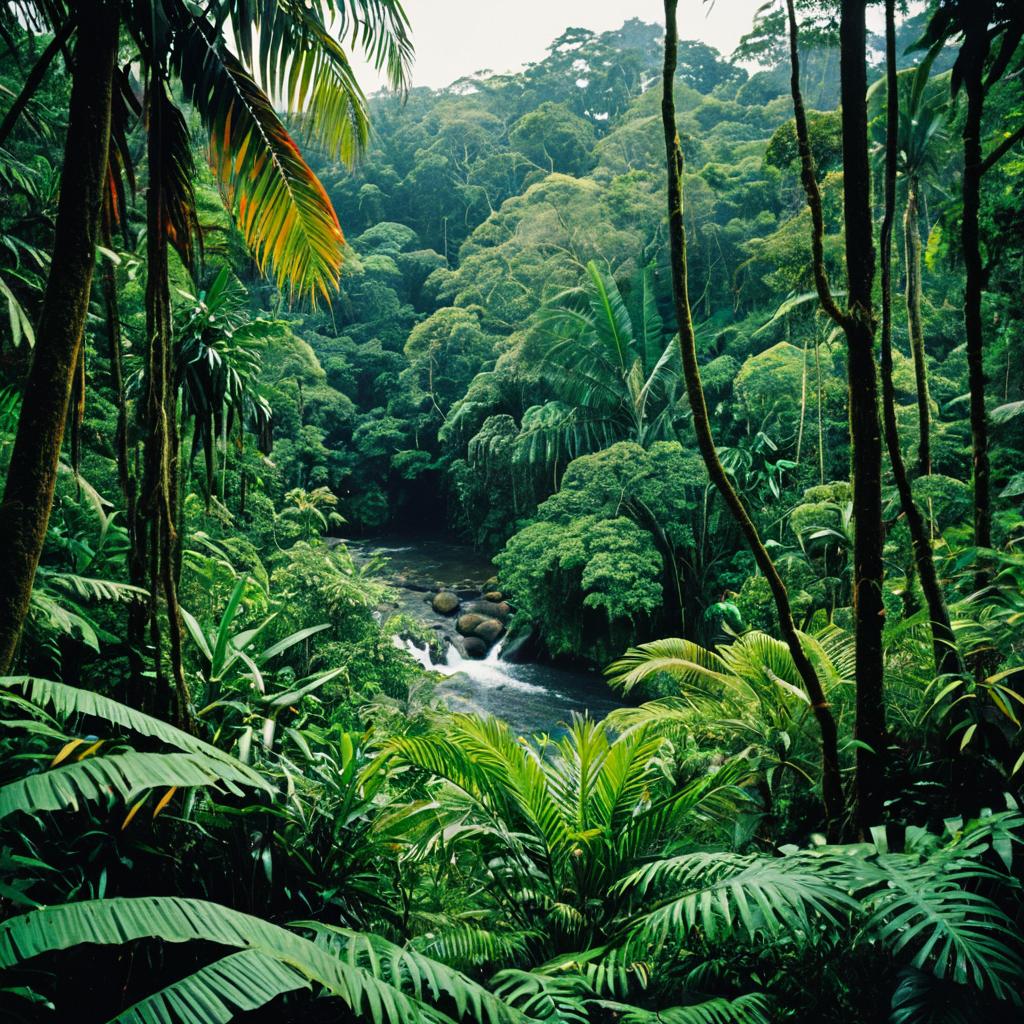 High-definition HDR wide-angle bird’s-eye view of a lush tropical rainforest, with terraced walls filled with orchids and vines, diffused sunlight, Unreal Engine.