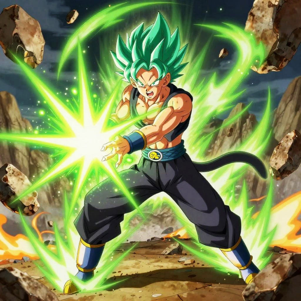 Dragon Ball Z green hair girl unleashing a powerful energy blast, surrounded by shattered rocks and explosive effects, dynamic anime style with glowing green hues and fierce action composition, set in a desolate battle arena.